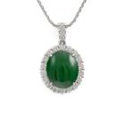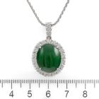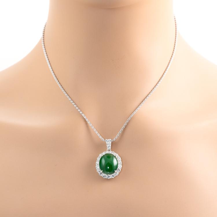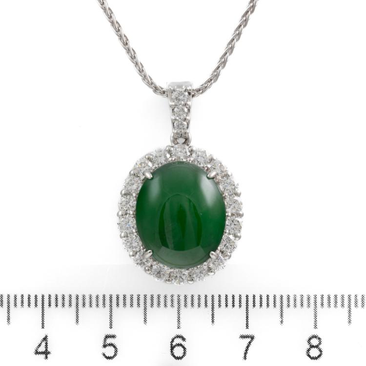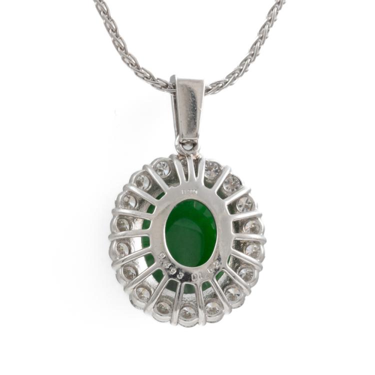 Jade and Diamond pendant with oval cabochon cut Natural green Jadeite Jade - Type A of 9.49ct and round Natural Diamonds totalling 1.62ct (Estimated grading: H SI). Platinum 900 with 18ct white gold 40cm chain. Weight: 13.2g. With Certificate #418913. (Pre-owned)