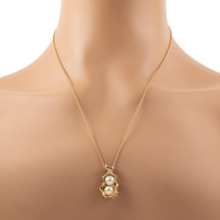 Pearl and Diamond pendant with 2 Akoya pearls of 7.6mm and round Natural Diamond of approximately 0.02ct. 14ct yellow gold with 14ct yellow gold 50cm chain. Weight: 7.5g. With copy of GSL Valuation #AA 63603, item 2. (Pre-owned)^