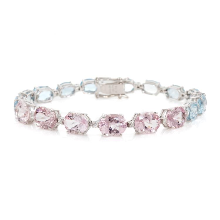 Aquamarine, Morganite and Diamond bracelet with Natural oval shape Aquamarine and Morganite totalling 22.74cts and round Natural Diamonds totalling 0.38cts (Estimated grading: G VS). 18ct white gold. Length: 17.5cm. Weight: 13.8g. With Certificate #417800. (Pre-owned)