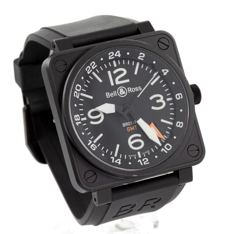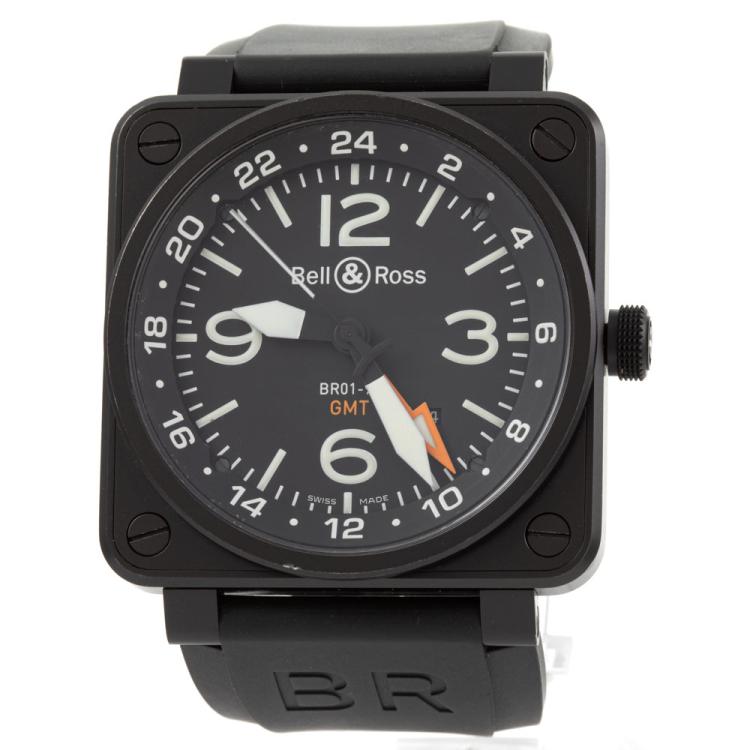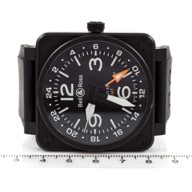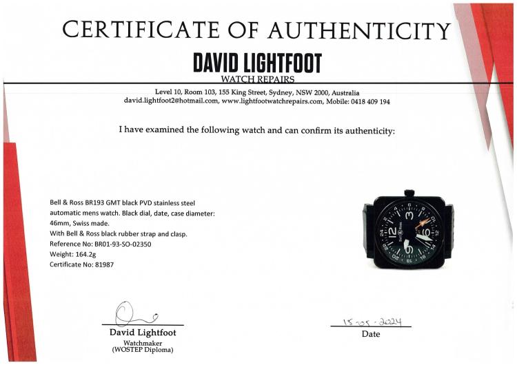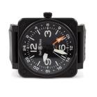 Bell & Ross BR193 GMT black PVD stainless steel automatic mens watch. Black dial, date, case diameter: 46mm, strap length: 21.5cm, Swiss made. Ref# BR01-93-SO-02350. With Bell & Ross black rubber strap and clasp. With Certificate of Authenticity. 3 month FSA warranty. (Pre-owned)
