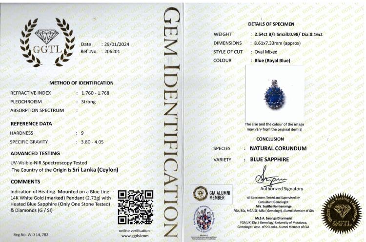 Sapphire and Diamond pendant with round & oval shape royal blue Ceylon Natural Sapphires totalling 3.52cts and round Natural Diamonds totalling 0.16cts. 14ct white gold. No chain provided. Weight: 2.7g. With GGTL Report #206201. (As new)