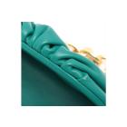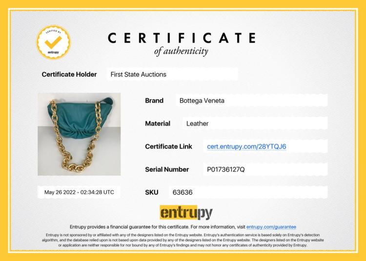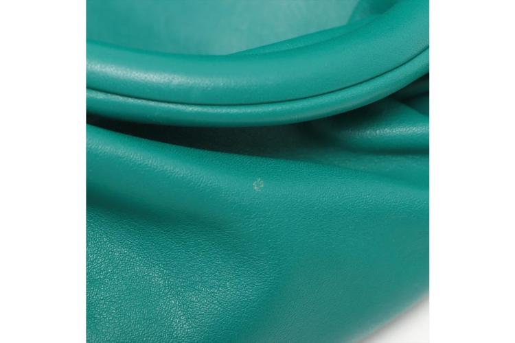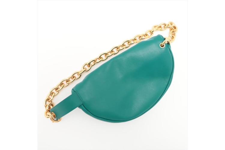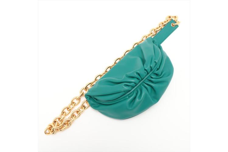 Bottega Veneta The Belt chain pouch in green leather. Featuring gold-tone hardware, adjustable waist strap, chain-link and gathered detailing. The snap closure on top opens to green leather interior. Approximate dimensions: 22cm (L) x 14cm (H) x 9cm (D), and 36cm chain drop. Accompanied by a Bottega Veneta dust bag. With Entrupy Certificate of Authenticity. (Pre-owned)