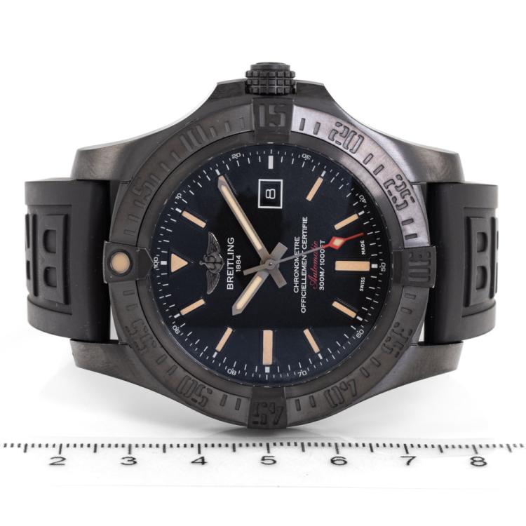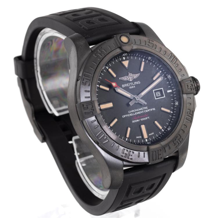 Breitling Avenger Blackbird special edition titanium automatic mens watch. Black dial, date, case diameter: 48mm, strap length: 24cm, Swiss made. Ref# V1731010.BD12. With Breitling black rubber strap and buckle. With Certificate of Authenticity, Breitling International E-warranty card dated 27/07/2014 and Breitling box. 3 month FSA warranty (Pre-owned)
