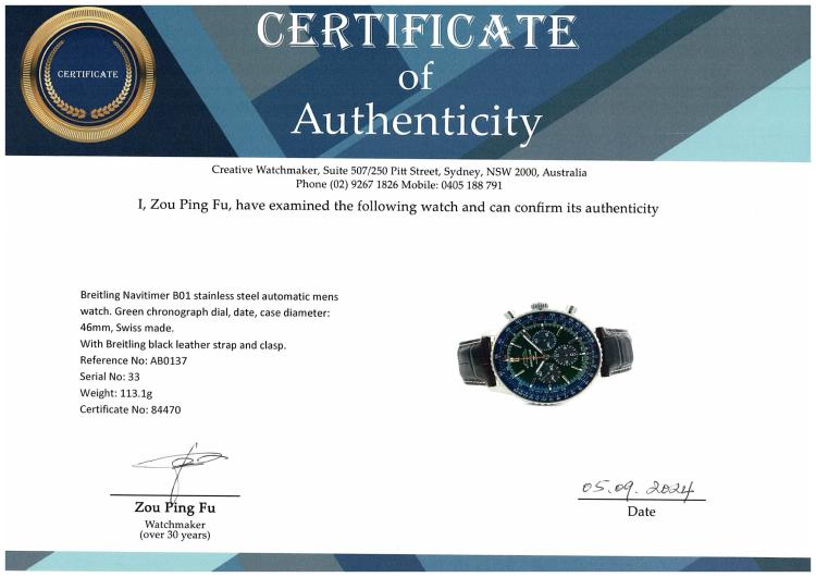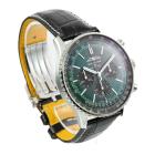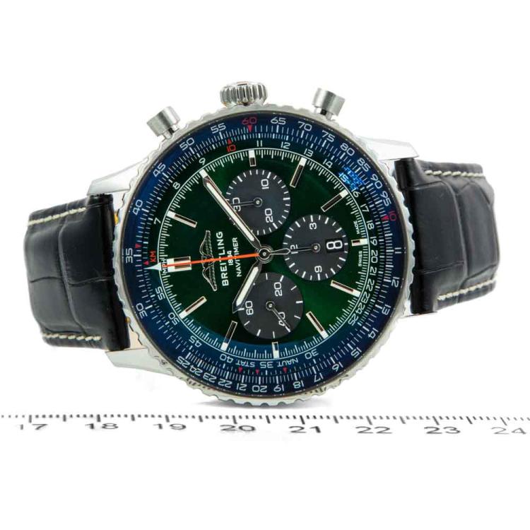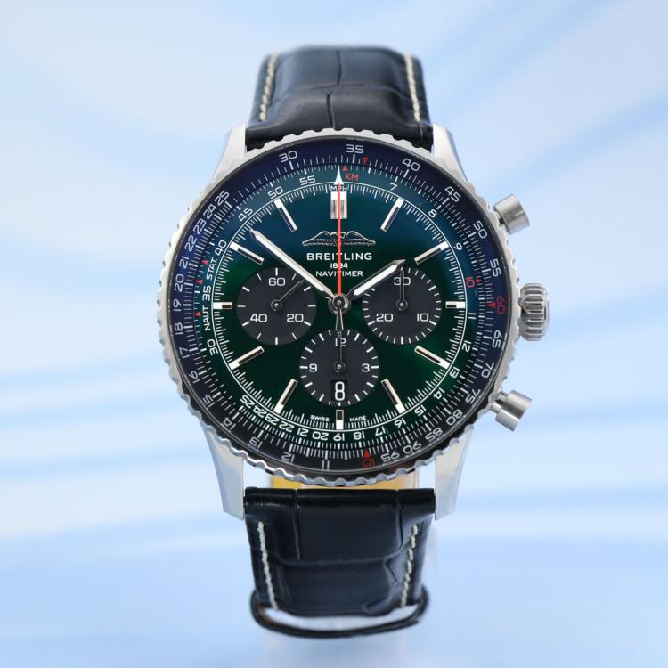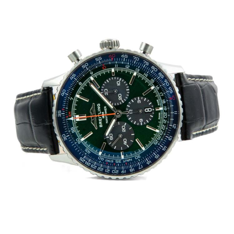 Breitling Navitimer B01 stainless steel automatic mens watch. Green chronograph dial, date, case diameter: 46mm, adjustable max wrist size: 19cm, Swiss made. Ref# AB0137. With Breitling black leather strap and clasp. With Certificate of Authenticity and Breitling Warranty card holder and Breitling box. 3 month FSA warranty (Pre-owned).