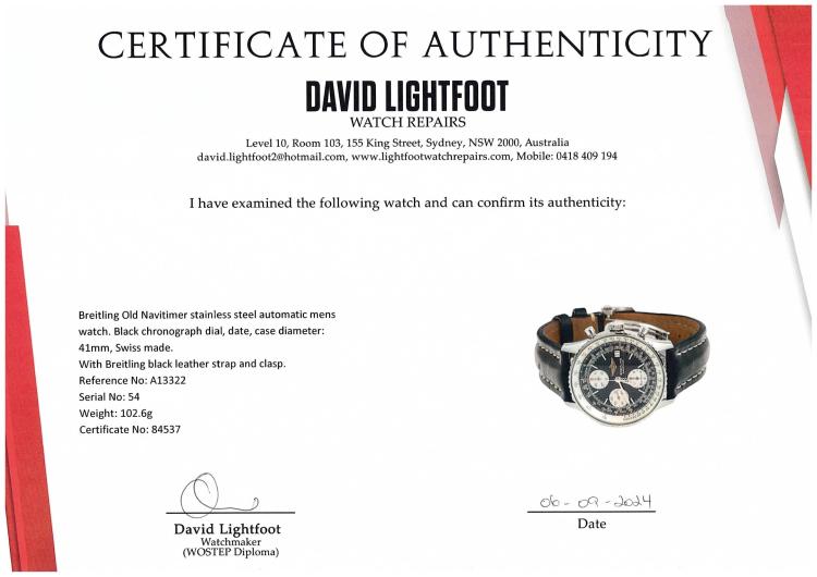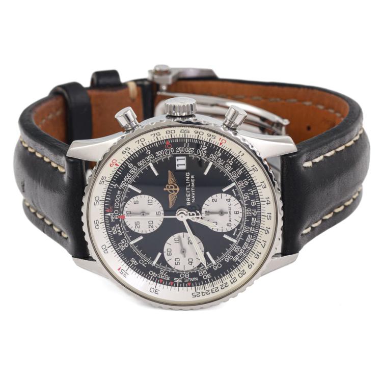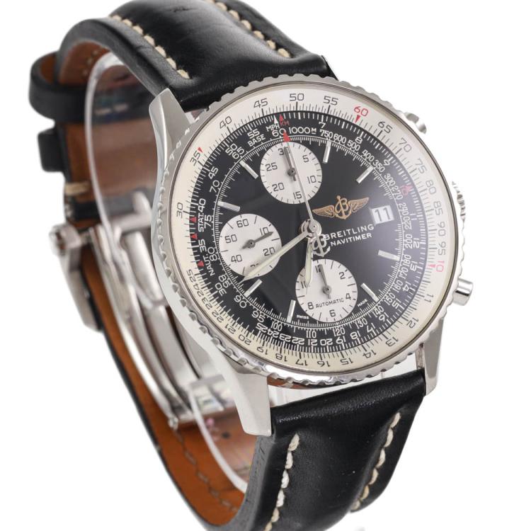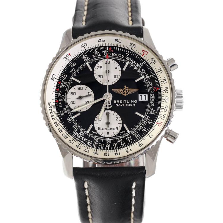 Breitling Old Navitimer stainless steel automatic mens watch. Black chronograph dial, date, case diameter: 41mm, adjustable maximum wrist size: 19.5m, Swiss made. Ref# A13322. With Breitling black leather strap and clasp. With Certificate of Authenticity and Breitling box. 3 month FSA warranty. (Pre-owned)