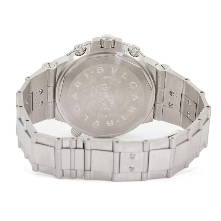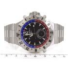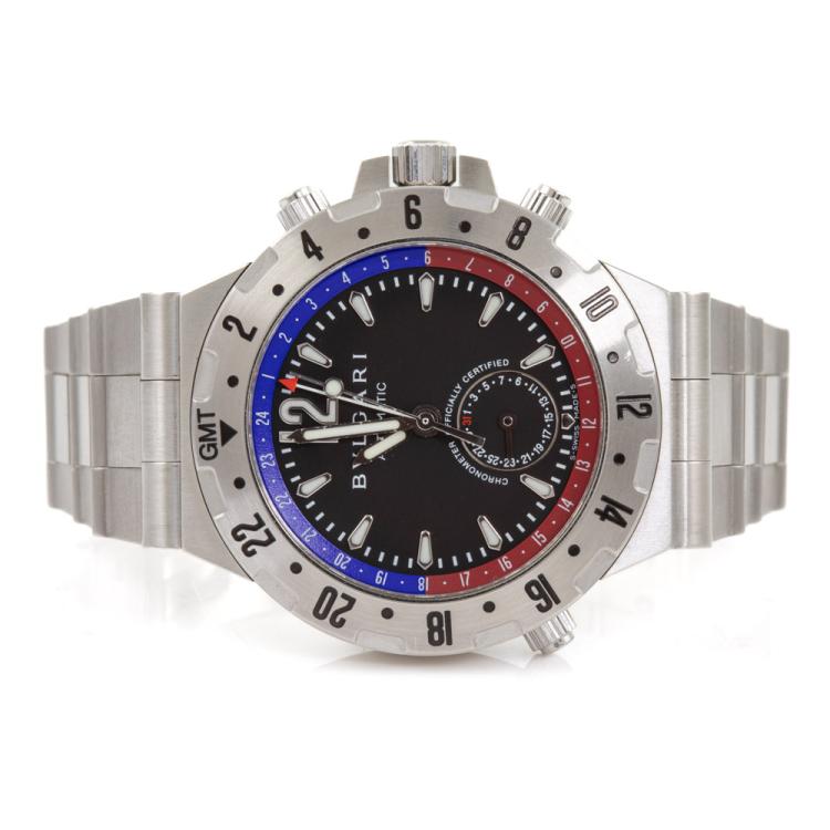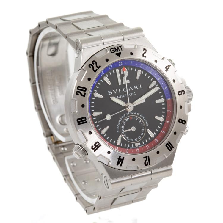 Bvlgari Diagono GMT stainless steel automatic mens watch. Black dial, case diameter: 40mm, wrist size: 17.5cm, Swiss made. Ref# GMT40S. With Bvlgari stainless steel bracelet and clasp. With Certificate of Authenticity, Undated Bvlgari International Warranty and Bvlgari box. 3 month FSA warranty. (Pre-owned)