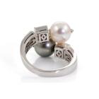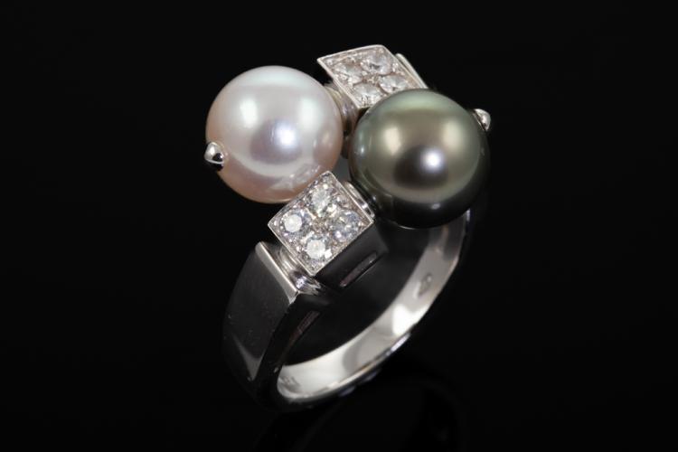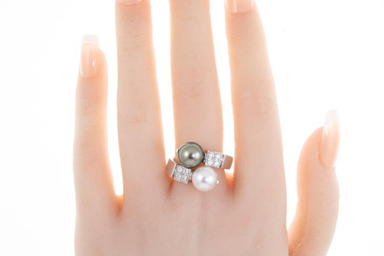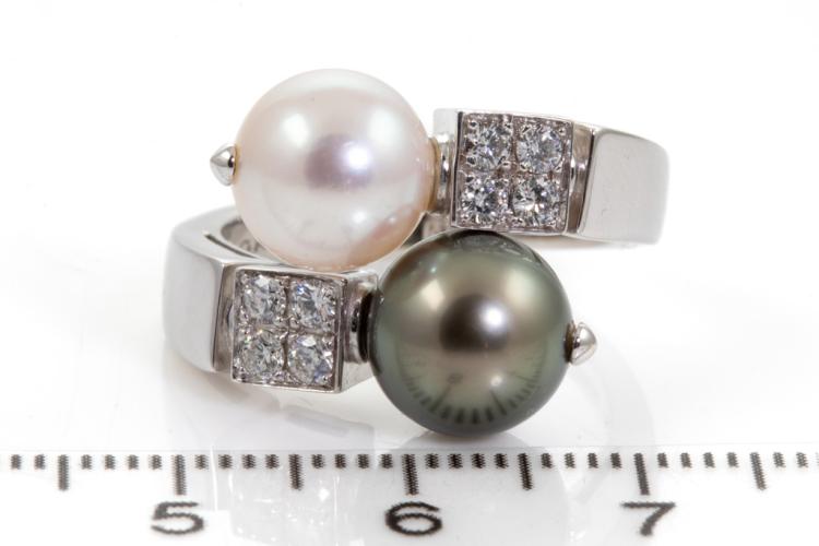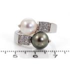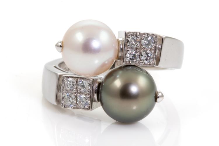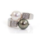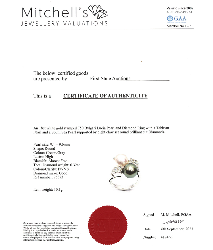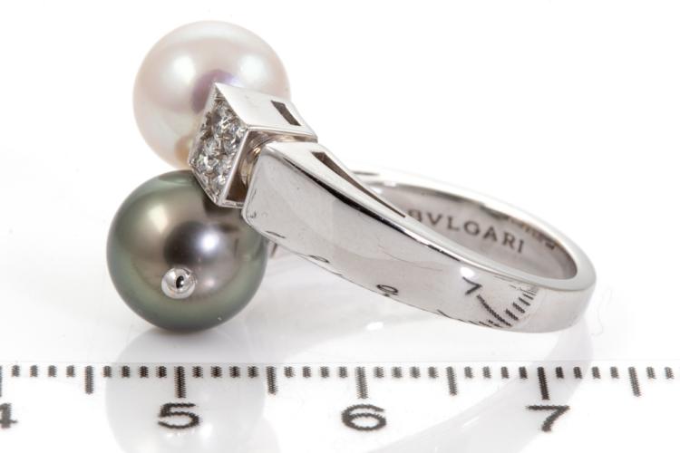 Bvlgari Lucia Pearl and Diamond ring with Tahitian and South Sea Pearl of 9.1mm-9.6mm and round Natural Diamonds totalling 0.32cts (Estimated grading: F VVS). 18ct white gold. Ring size O - ring resizing is not recommended. Weight: 10.1g. With Certificate 417456. (Pre-owned)