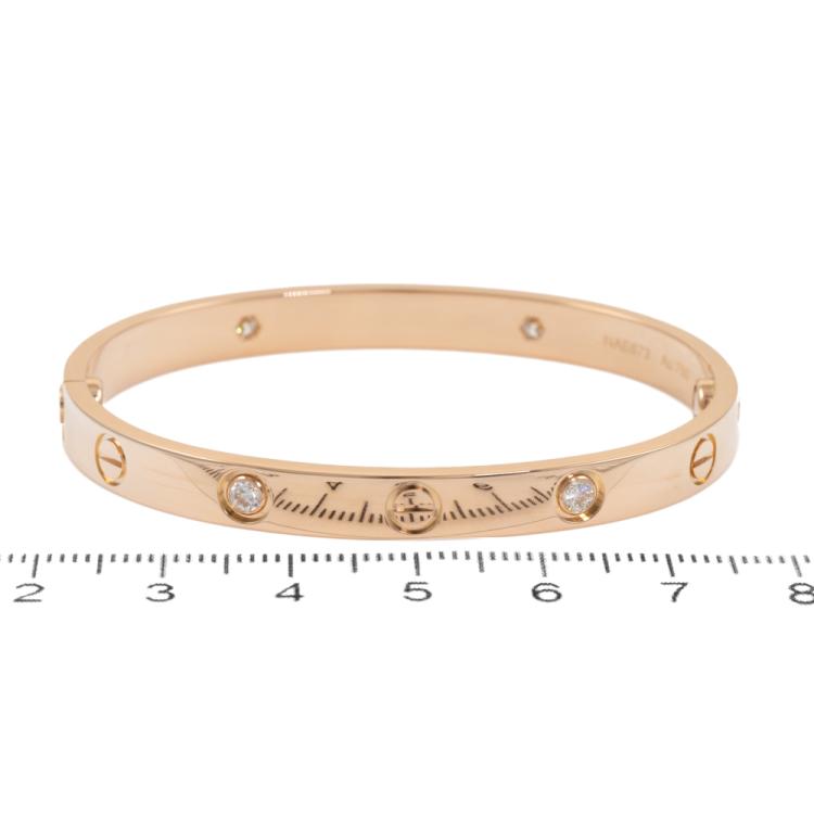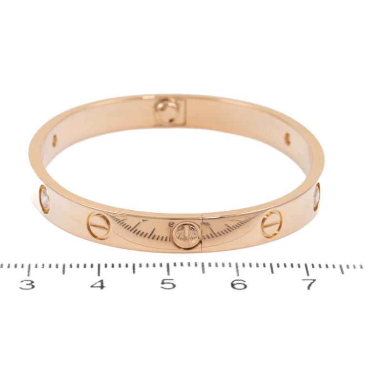 Cartier Love bracelet with 4 round natural brilliant cut Diamonds totalling 0.42ct (Estimated grading: F VS). 18ct rose gold. Cartier stamped size 16. Width: 5.8mm. Weight: 27.3g. With Certificate #418824. (Pre-owned)