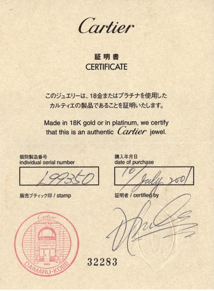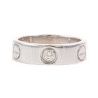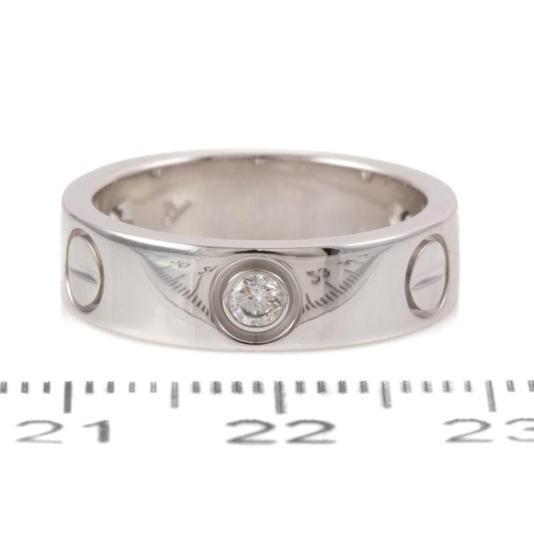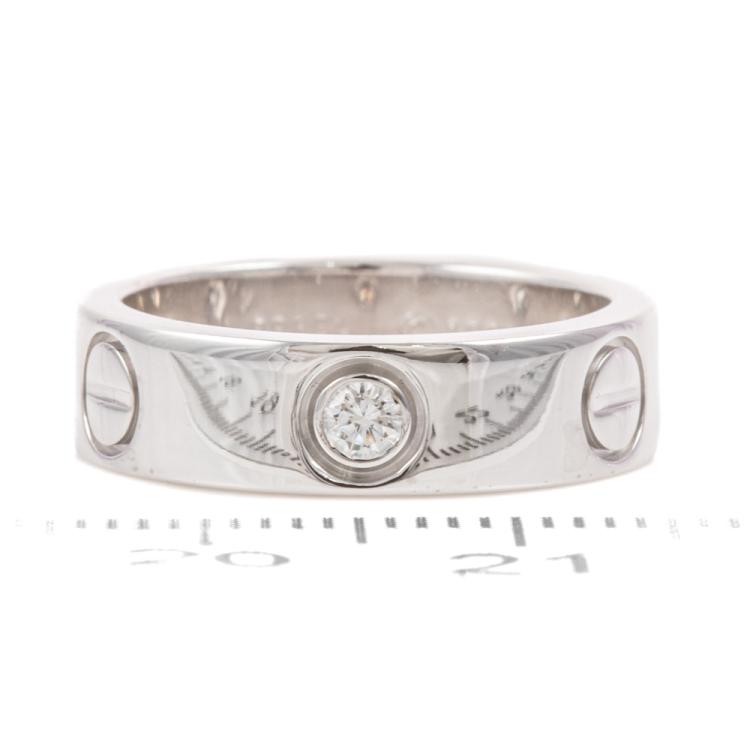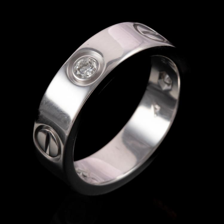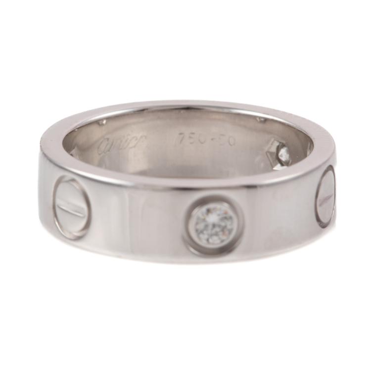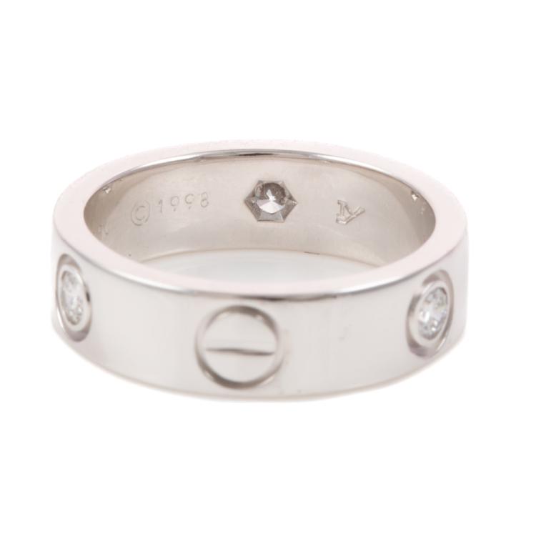 Cartier Love ring with 3 round Natural Diamonds totalling approximately 0.22ct. 18ct white gold. Cartier stamped size 50, actual ring size J1/2- ring resizing is not recommended. Band width: 5.2mm. Circa: Weight: 7.3g. With Cartier Certificate #L99350 dated 10/07/2001 (Pre-owned)