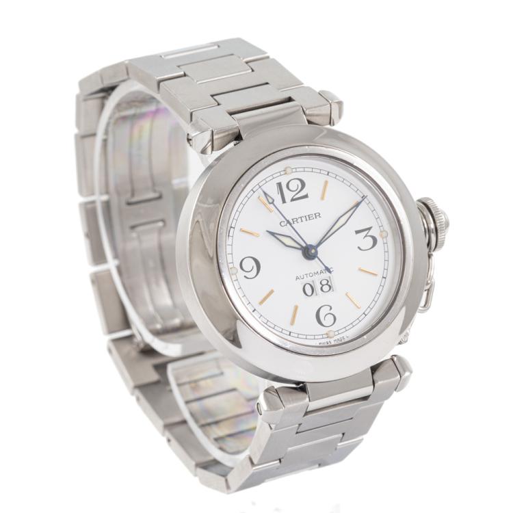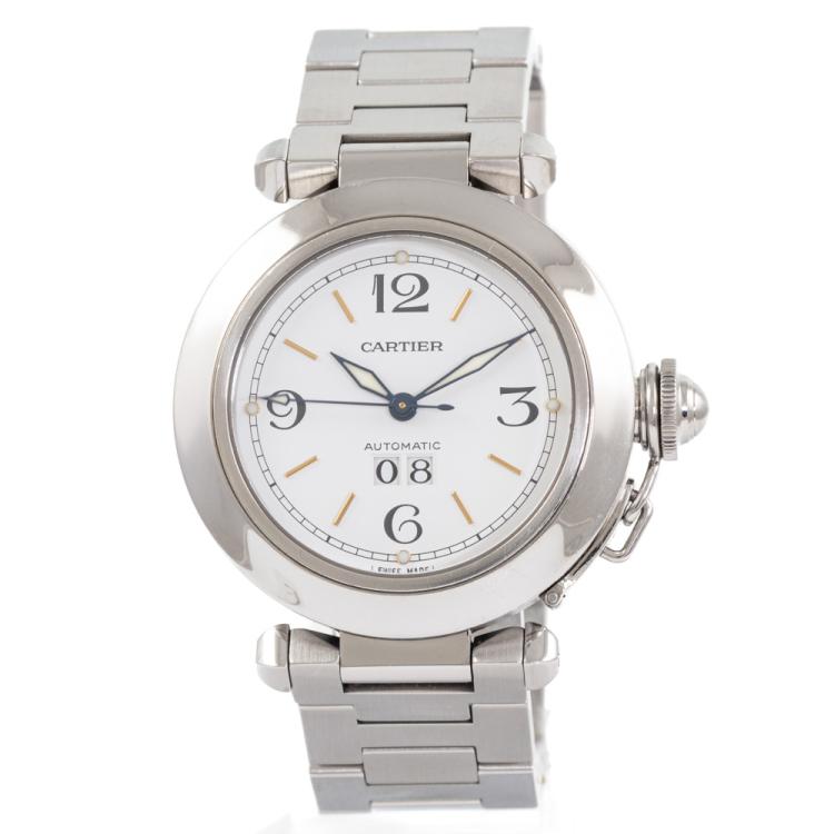 Cartier Pasha C stainless steel automatic watch. White dial, date, case diameter: 35mm, wrist size: 17cm, Swiss made. Ref# 2475. With Cartier stainless steel bracelet and clasp. With Certificate of Authenticity, Cartier Certificate booklet dated 16/7/2000, Cartier cleaning kit and Cartier box. 3 month FSA warranty. (Pre-owned)