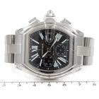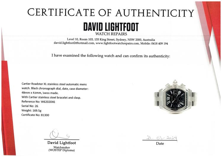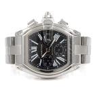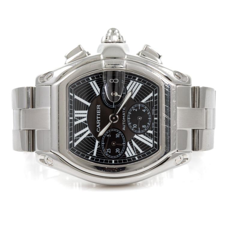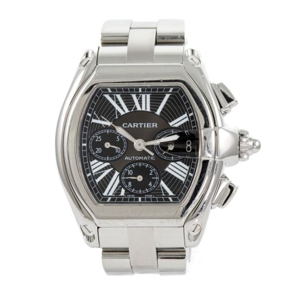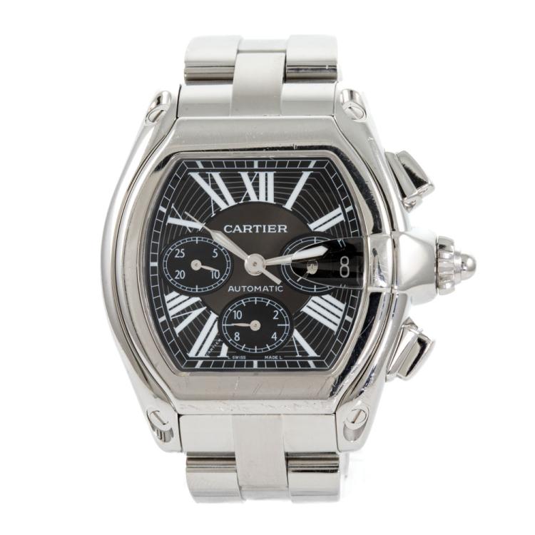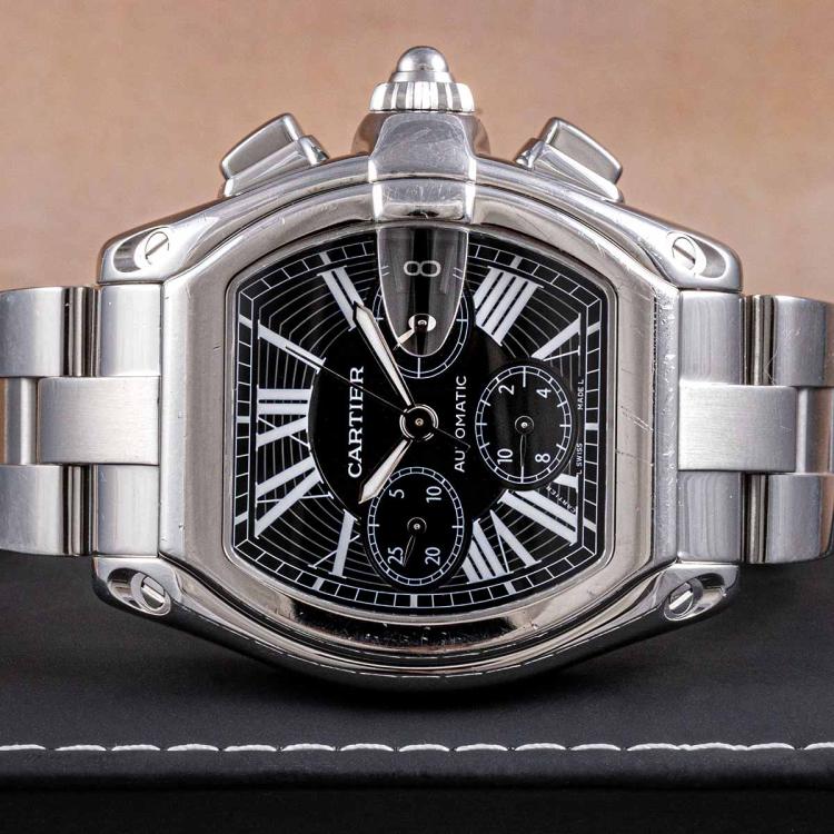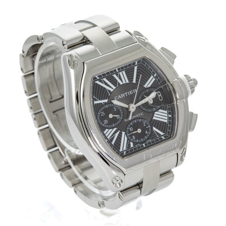 Cartier Roadster XL stainless steel automatic mens watch. Black chronograph dial, date, case diameter: 48mm x 43mm, wrist size: 16cm, Swiss made. Ref# W62020X6. With Cartier stainless steel bracelet and clasp. With Certificate of Authenticity. 3 month FSA warranty (Pre-owned)
