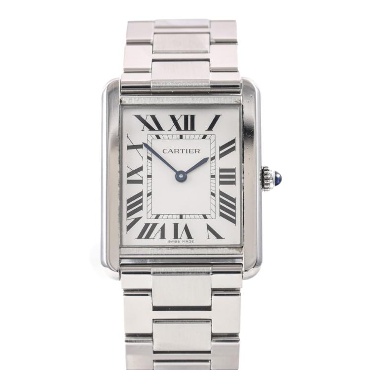 Cartier Tank Solo stainless steel quartz watch. Silver dial, case diameter: 34mm x 27mm, wrist size: 18cm, Swiss made. Ref# W5200014/3169. With Cartier stainless steel bracelet and clasp. With Certificate of Authenticity, Cartier International Limited Warranty card dated 19/10/2020 and Cartier box. 3 month FSA warranty. (Pre-owned)
