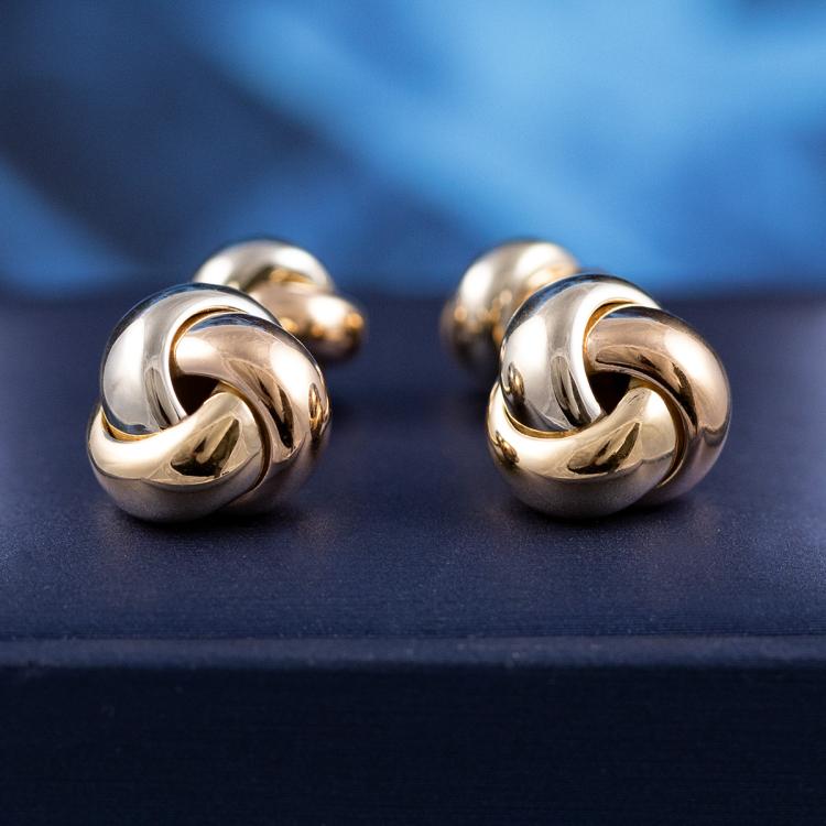 Cartier Trinity Cufflinks. 18ct yellow, white, and rose gold. The large knot measures 13.2mm in diameter and the smaller knot measures 10.2mm with a bar connecting the two. The cufflinks measure 27.0mm in length. Weight: 19.4g. With certificate #418389. (Pre-owned)