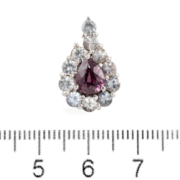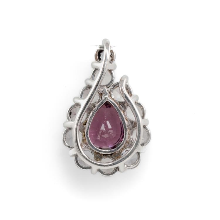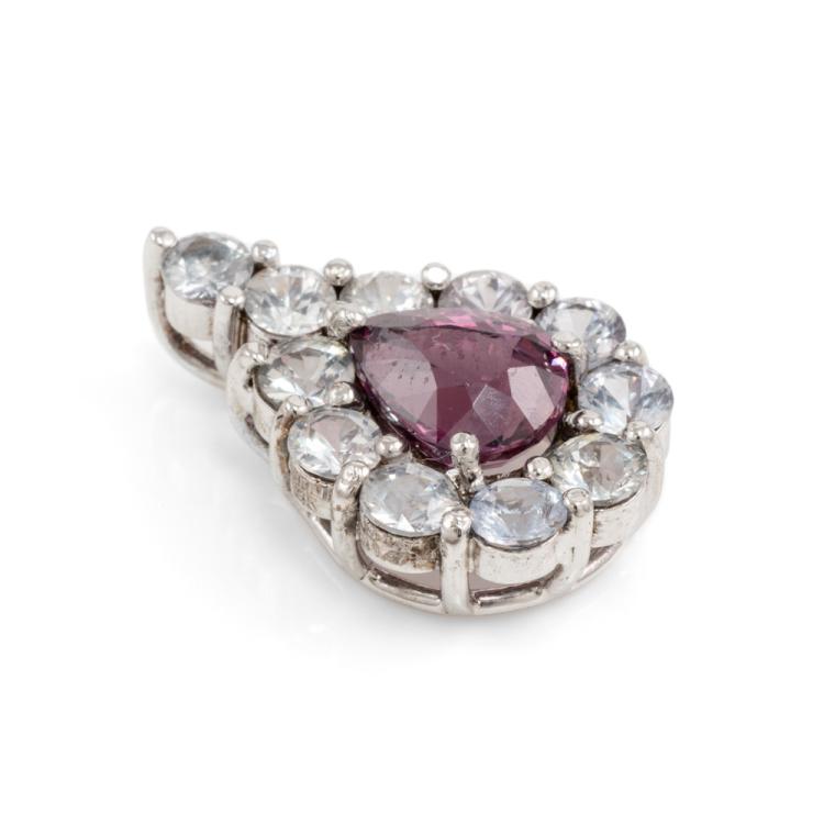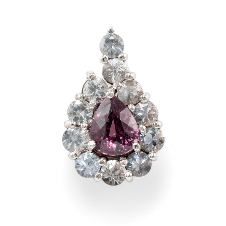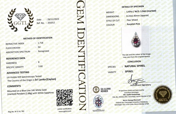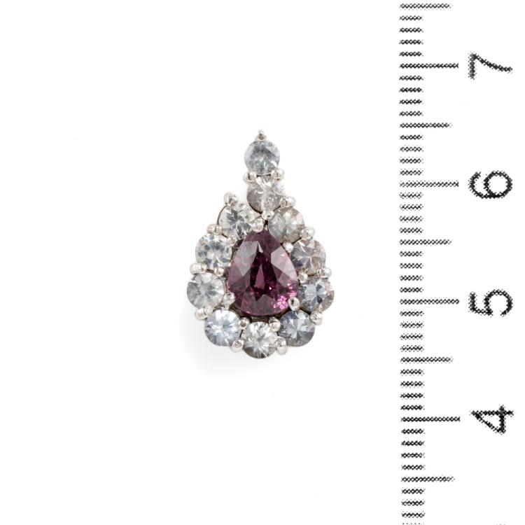 Spinel and Sapphire pendant with a centre pear shape purplish pink Ceylon Natural Spinel of 1.47ct and round light blueish grey Natural Sapphires totalling 1.54cts. 14ct white gold. No chain provided. Weight: 2.9g. With GGTL Report #201012. (As new)^