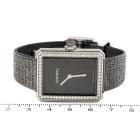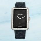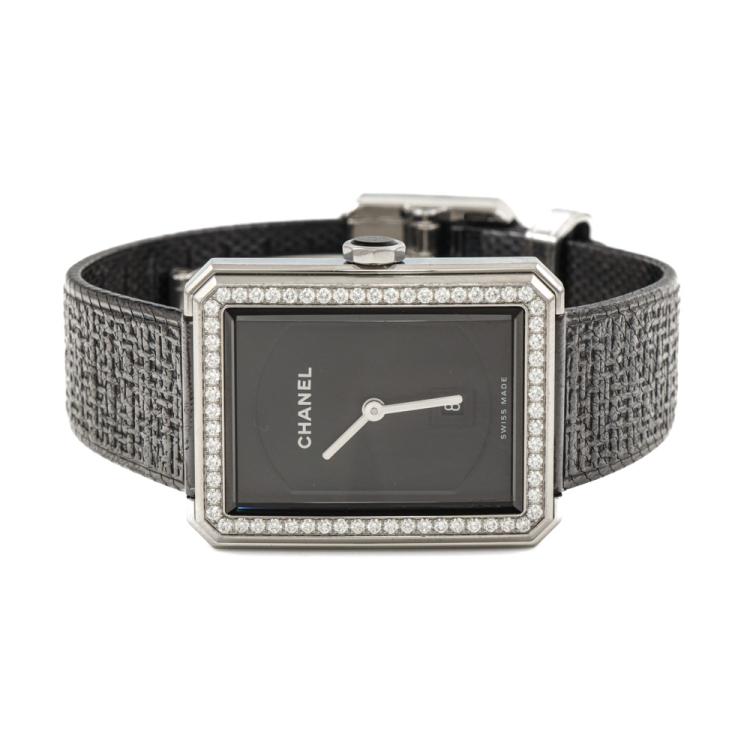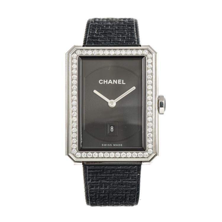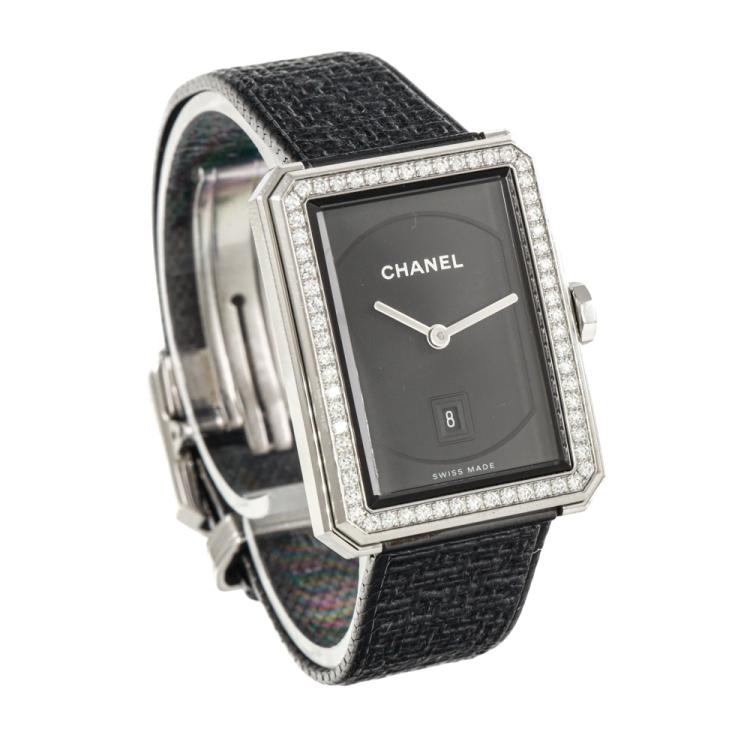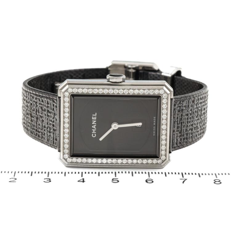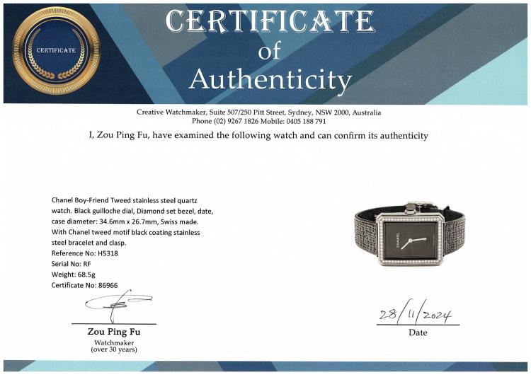 Chanel Boy-Friend Tweed medium version stainless steel quartz ladies watch. Black guilloche dial, Diamond set bezel, date, case diameter: 34.6mm x 26.7mm, strap length including case: 16.5cm, Swiss made. Ref# H5318. With Chanel tweed motif black coating stainless steel bracelet and clasp. With Certificate of Authenticity. 3 month FSA warranty. (Pre-owned)