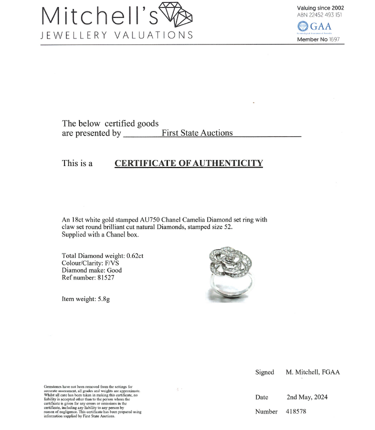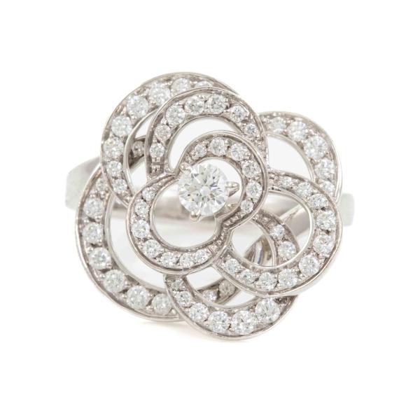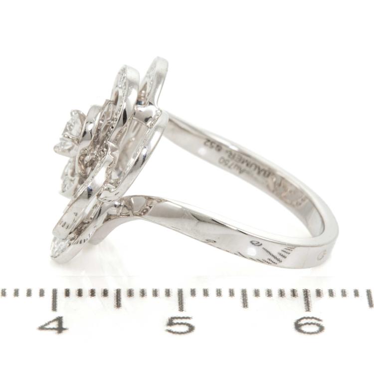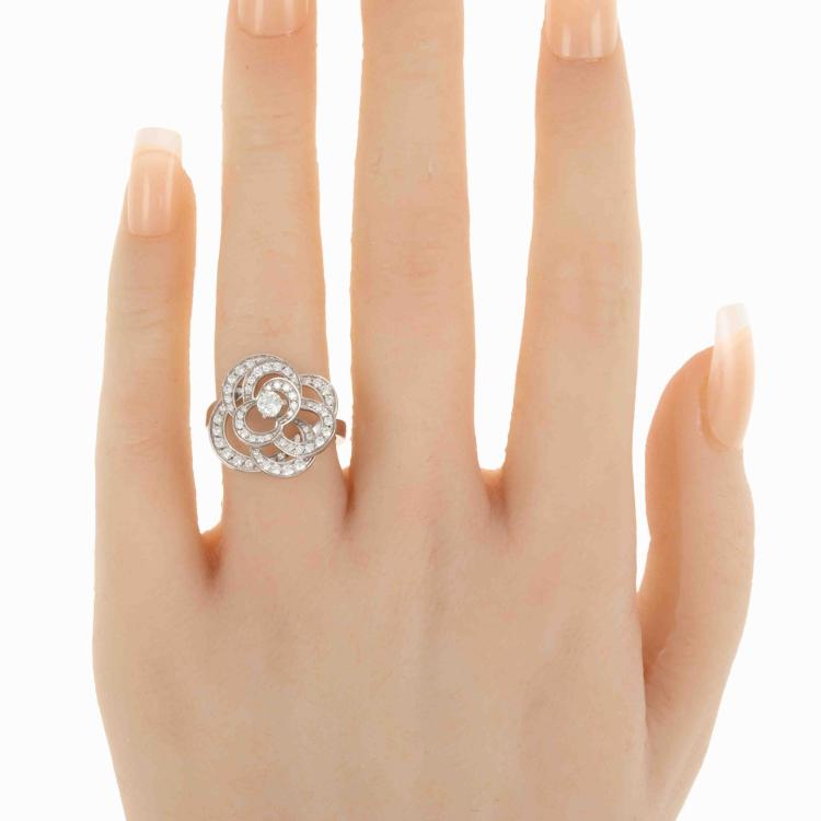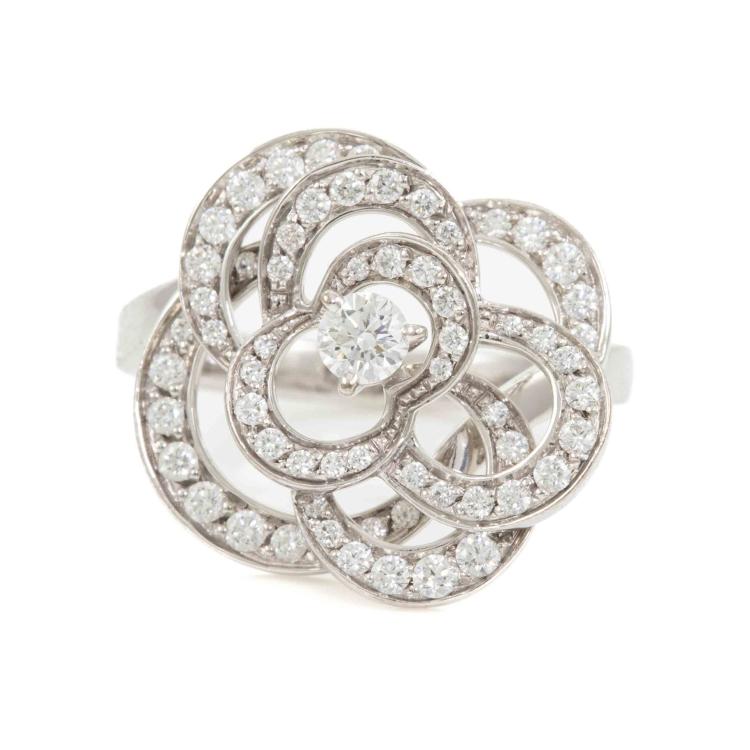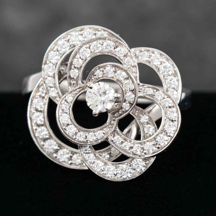 Chanel Fil De Camellia Diamond ring with round natural Diamonds totalling 0.62cts (Estimated grading: F VS). 18ct white gold. Stamped size 52, L1/2 - ring resizing is not recommended. Band width: 2.4mm. Weight: 5.8g. With Chanel box. With Certificate #418578. (Pre-owned)