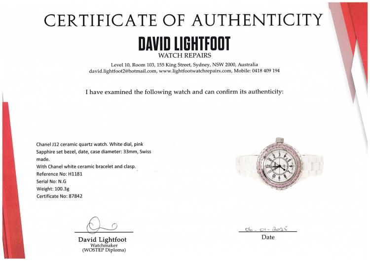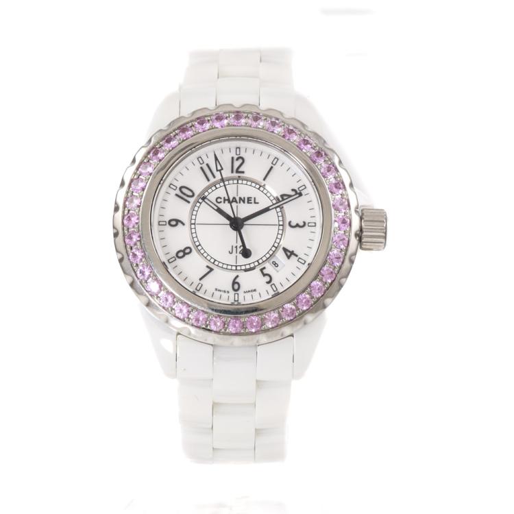 Chanel J12 ceramic quartz ladies watch. White dial, pink Sapphire set bezel, date, case diameter: 33mm, wrist size: 17cm, Swiss made. Ref #H1181. With Chanel white ceramic bracelet and clasp. With Certificate of Authenticity, Chanel International Guarantee card dated 05/2004 and Chanel box with Chanel case. 3 month FSA warranty (Pre-owned)