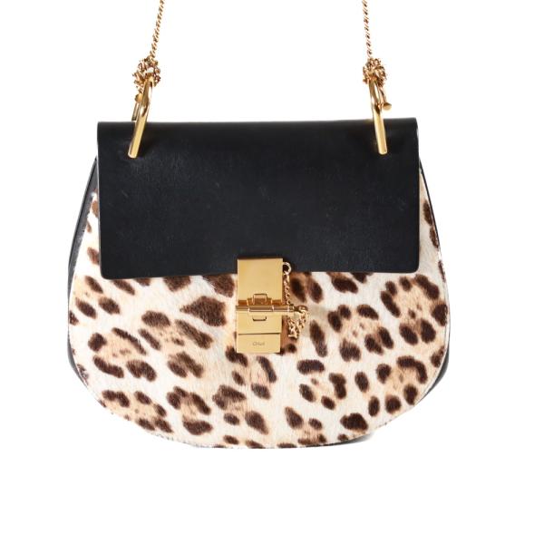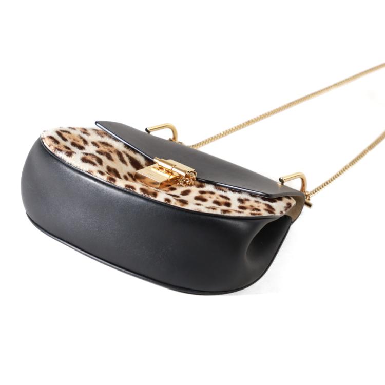 Chloe Drew Leopard crossbody bag in leopard printed calf hair panel and smooth black calfskin leather. Featuring gold-toned hardware, long gold chain strap with gold links, and a frontal flap with a peg-and-eye turn-lock closure. This opens to a beige microfibre interior with a patch pocket. Approximate dimensions: 23cm(L) x 20cm(H) x 7cm(D), strap drop 50cm. Accompanied by Chloe dustbag and authentication card. With Entrupy Certificate of Authenticity. (Pre-owned)