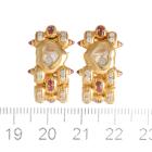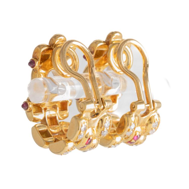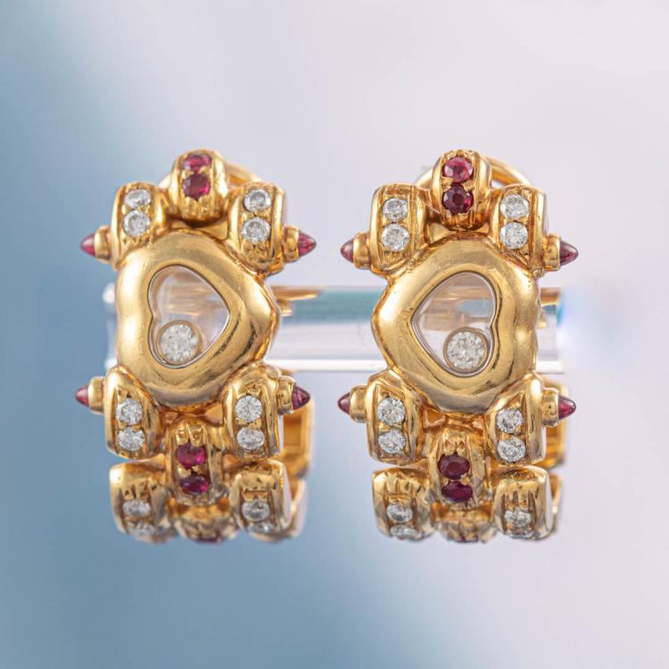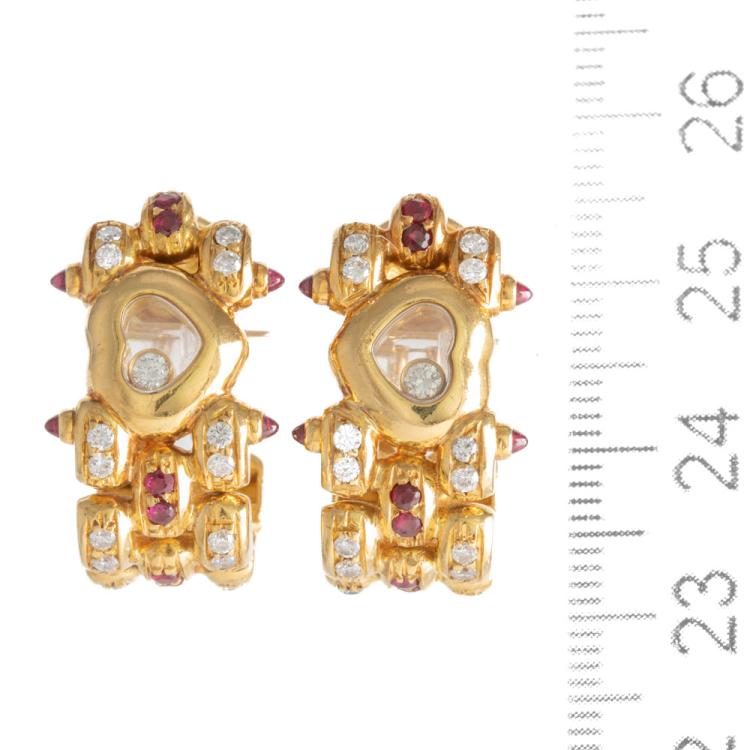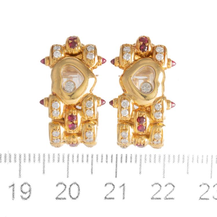 Chopard Happy Ruby Diamond clip-on earrings with round Natural Diamonds totalling approximately 0.36ct (Estimated grading: F VS) and round Natural rubies totalling 0.08ct. 18ct yellow gold. Weight: 20.4g. With Certificate #419125 (Pre-owned)