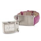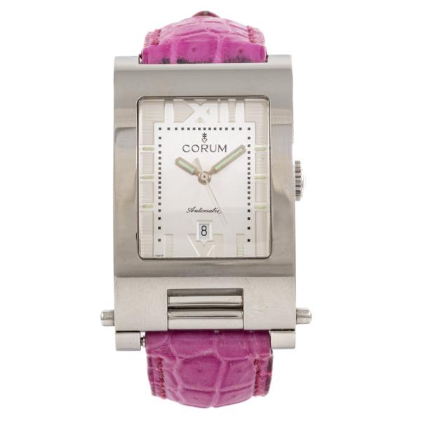 Corum Tabogan stainless steel automatic ladies watch. Silver dial, date, case diameter: 27mm x 40mm, wrist size: 20.5cm, Swiss made. Ref #14515120. With pink leather strap and buckle. With Certificate of Guarantee & Corum Box. 3 month FSA warranty. (As New)