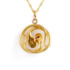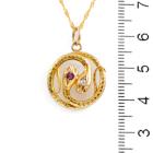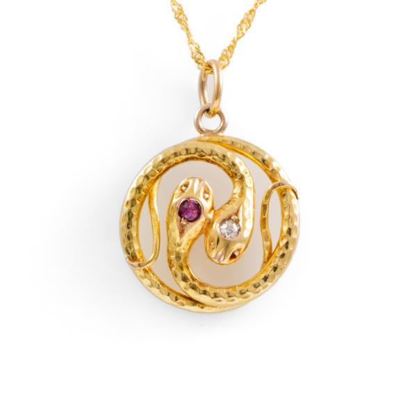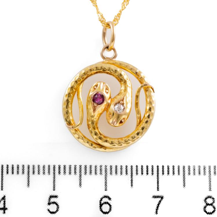 Double snake pendant with round natural Ruby of approximately 0.03ct and round natural Diamond of approximately 0.03ct. 18ct yellow gold with 41cm 18ct yellow gold chain. Weight: 5.4g (Pre-owned)