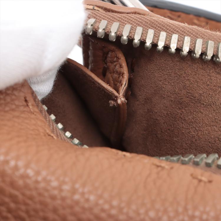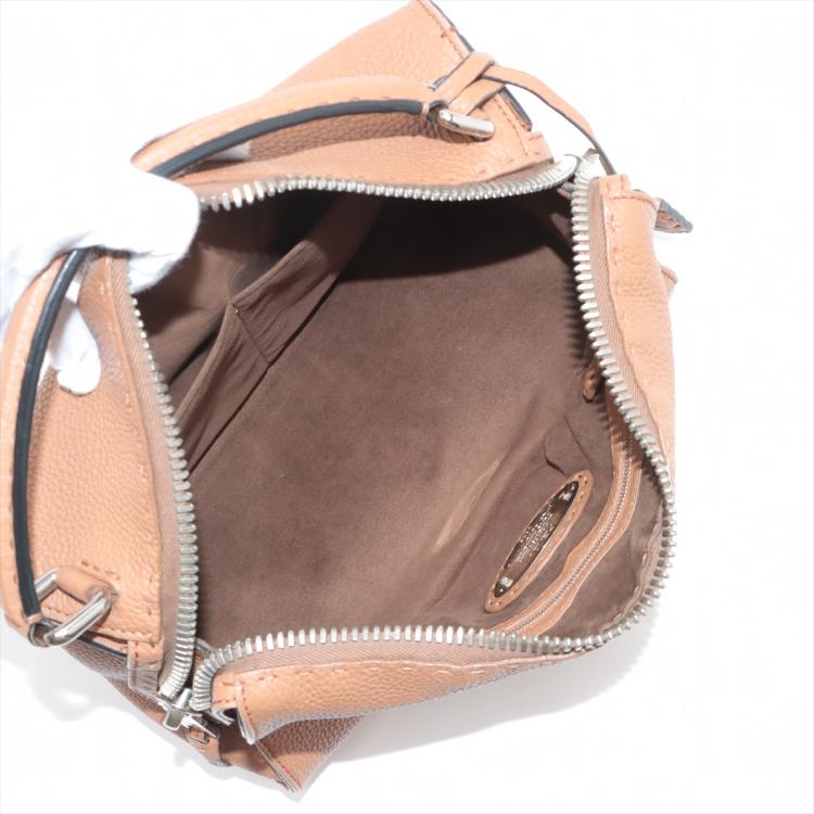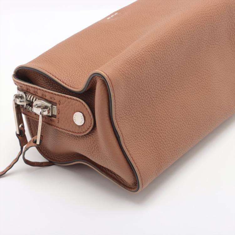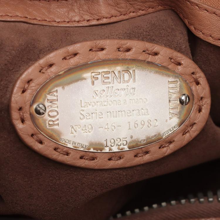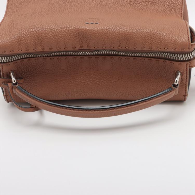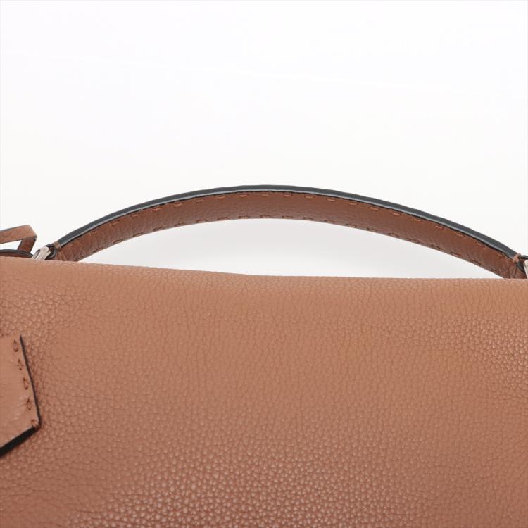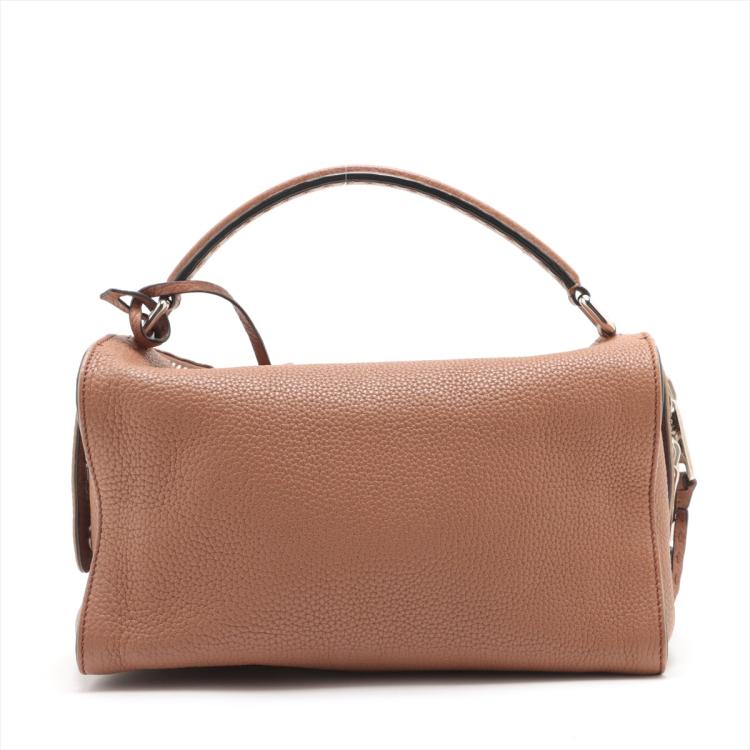 Fendi Selleria Lei Boston tote in light brown grained calfskin leather. Featuring silver-tone hardware, Single leather top handle and an optional wide shoulder strap. The over-extended top zipper opens to a brown microfiber interior with zipper and patch pockets. Approximate dimensions: 30cm(L) x 17.5cm(H) x 14.5cm(D), 9cm handle drop and 48.5cm strap drop. Accompanied by leather crochet, keyring and a Fendi dust bag. With Entrupy Certificate of Authenticity. (Pre-owned)