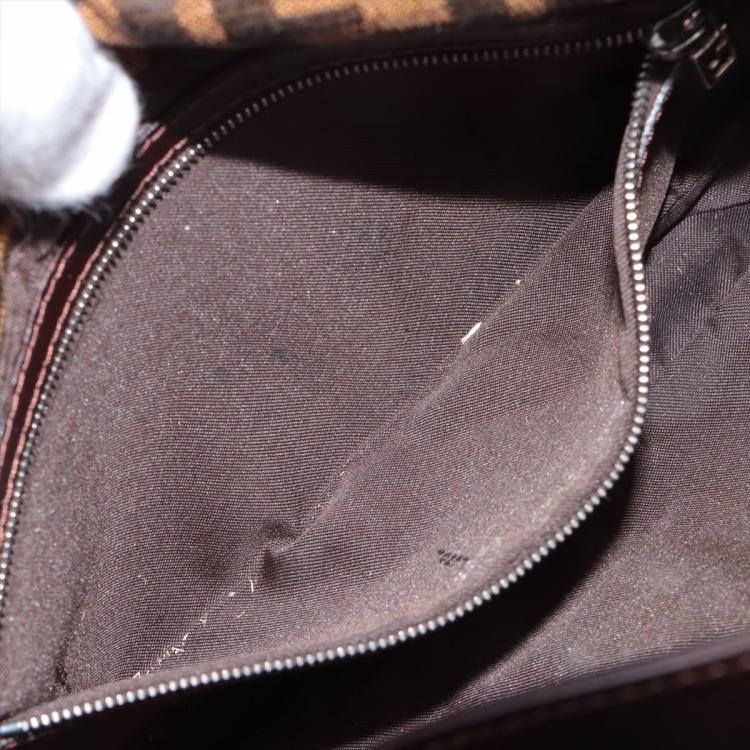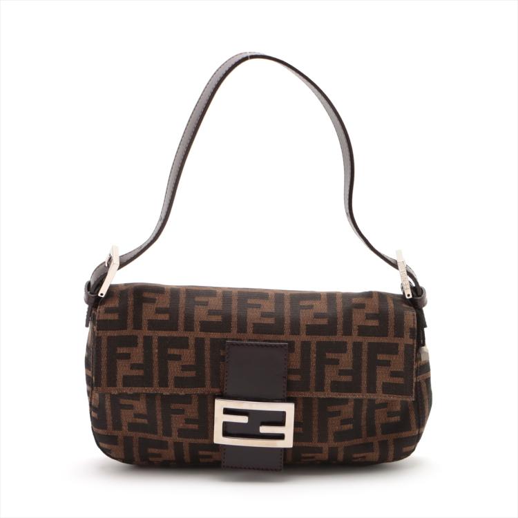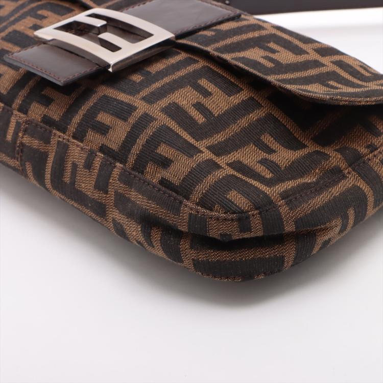 Fendi Baguette shoulder bag in Zucca canvas in brown. Featuring a dark chocolate brown leather looping shoulder strap and facing flap with FF logo detail, silver tone hardware. The magnetic button closure opens to a brown fabric interior with a zipper pocket. Approximate dimensions: 25.5cm(L) x 14cm(H) x 4cm(D), 19cm handle drop. Accompanied by a Fendi dust bag. With Entrupy Certificate of Authenticity. (Pre-owned)