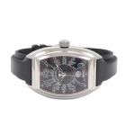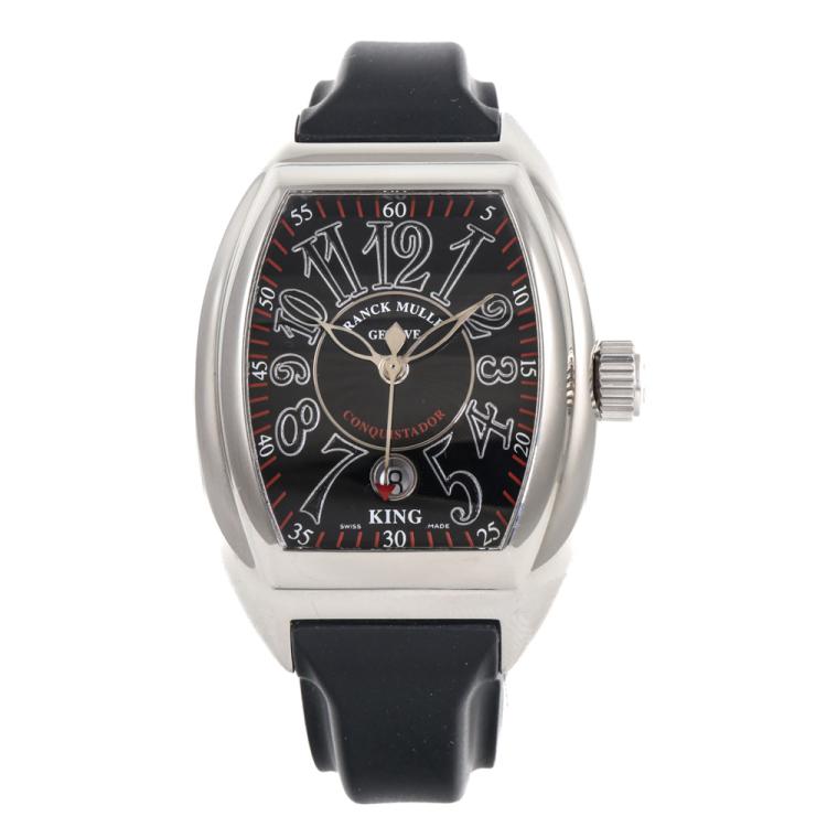 Franck Muller Conquistador King stainless steel automatic mens watch. Black dial, date, approximate case diameter: 40mm x 56mm, strap length including case: 21cm, Swiss made. Ref# 8005KSC. With Franck Muller black rubber strap and buckle. With Certificate of Authenticity, Franck Muller Certificate of Origin & Warranty dated 13/08/2008 and Franck Muller box. 3 month FSA warranty. (Pre-owned)