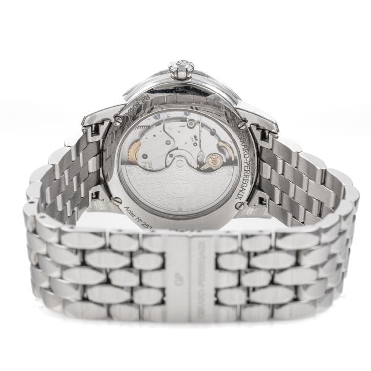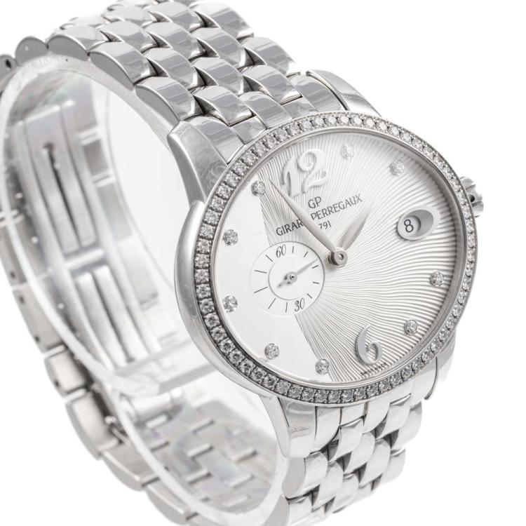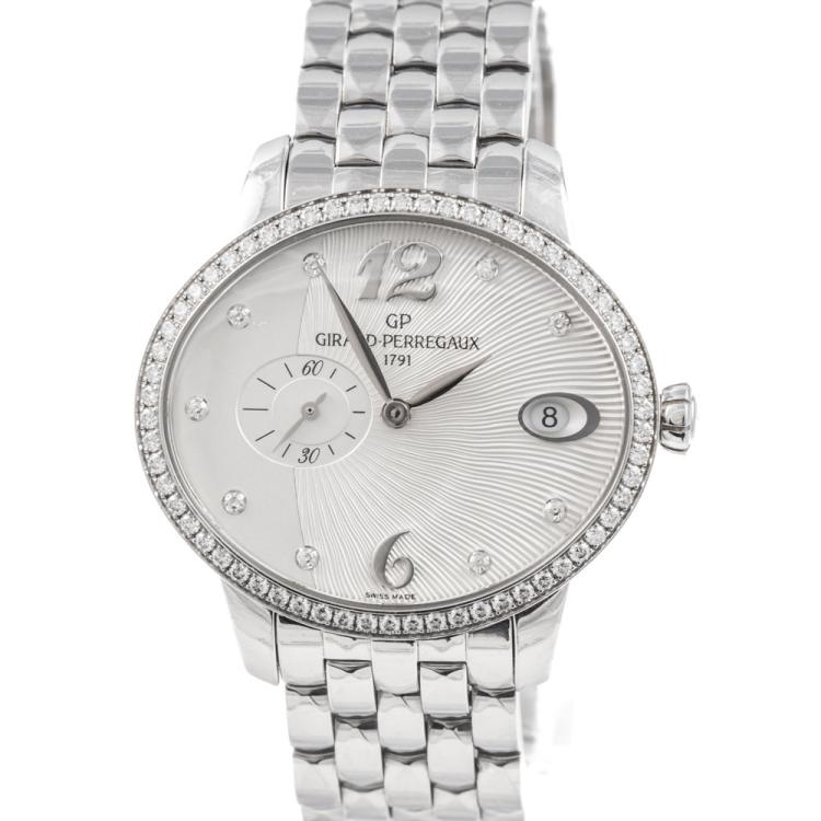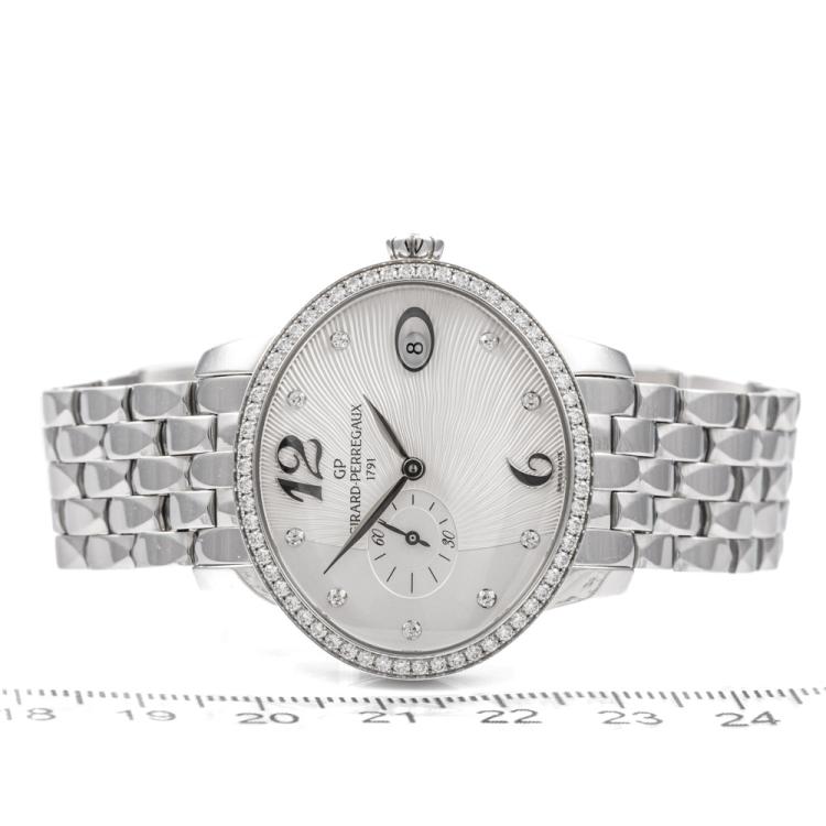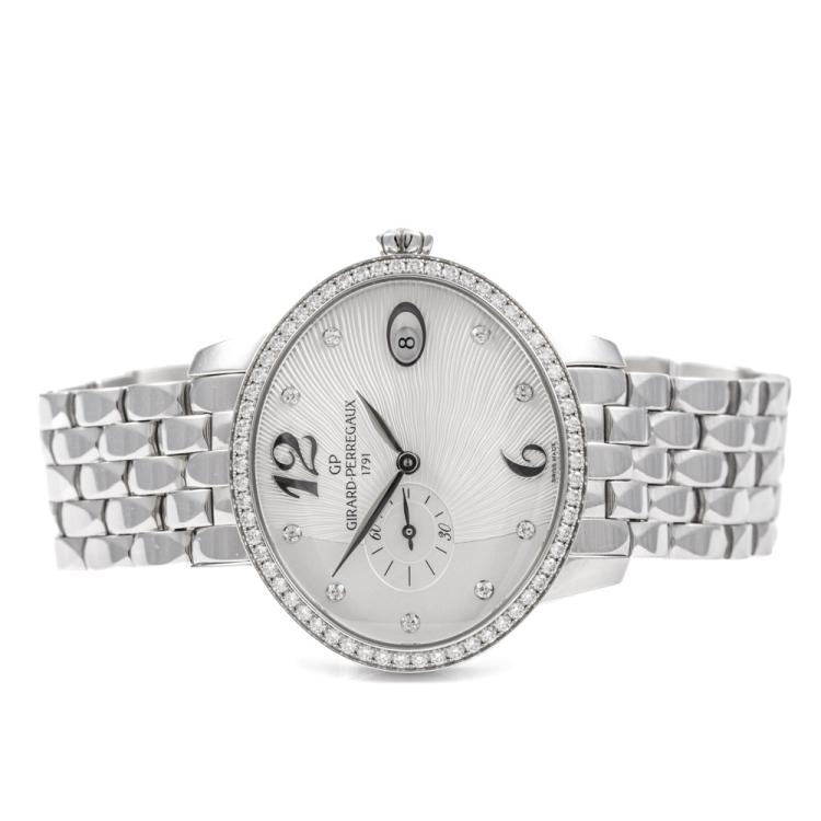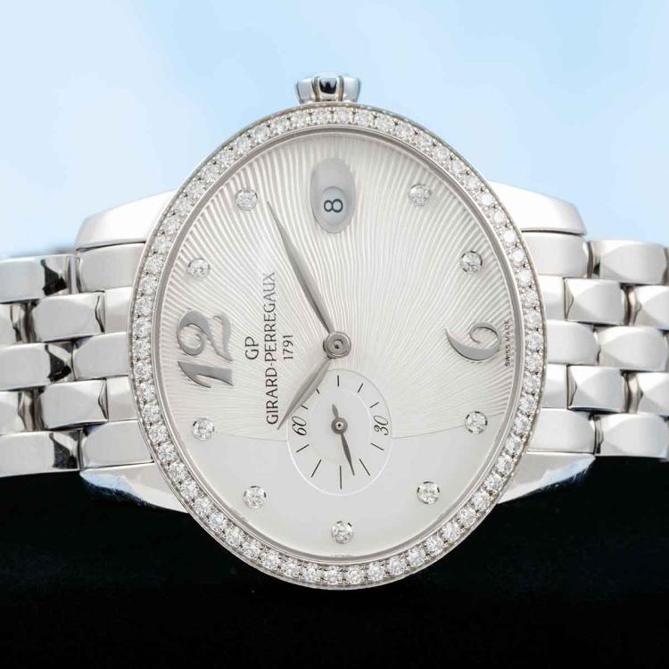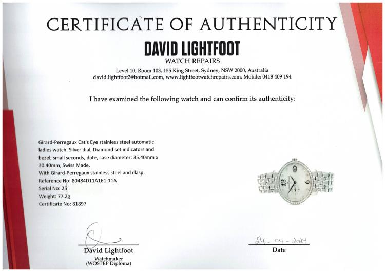 Girard-Perregaux Cat's Eye stainless steel automatic ladies watch. Silver dial, Diamond set indicators and bezel, small seconds, date, case diameter: 35.40mm x 30.40mm, wrist size: 17cm. Swiss Made. Ref# 80484D11A161-11A. With Girard-Perregaux stainless steel and clasp. With Certificate of Authenticity, Girard-Perregaux International Warranty Card dated 21/07/2019 and Girard-Perregaux box. 3 month FSA warranty (Pre-owned)