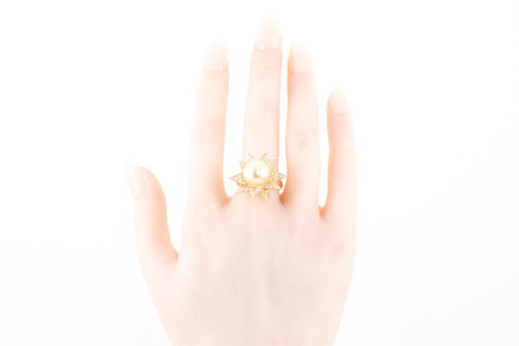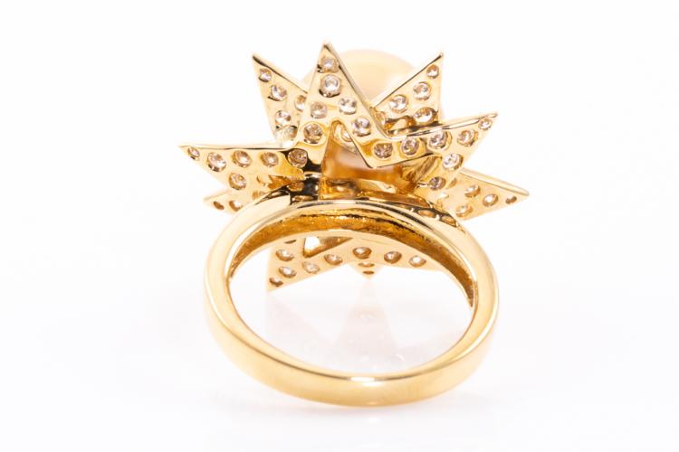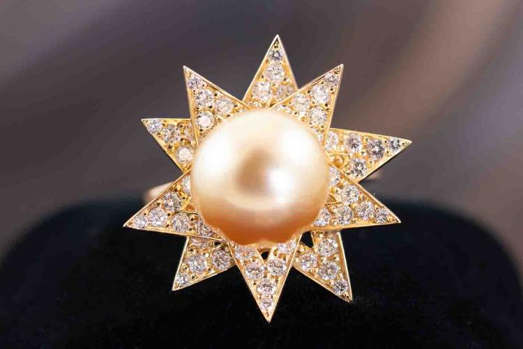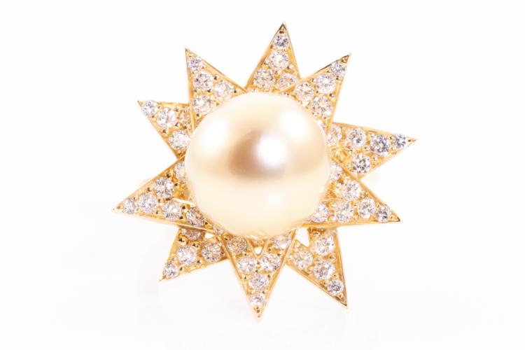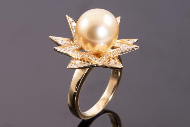 Pearl and Diamond ring with Golden South Sea Pearl of 11.5mm and round Natural Diamonds totalling 1.27ct (Estimated grading: G-H SI). 18ct yellow gold. Ring size L. Weight: 9.9g. (Pre-owned)