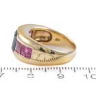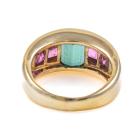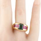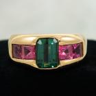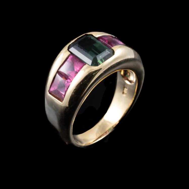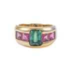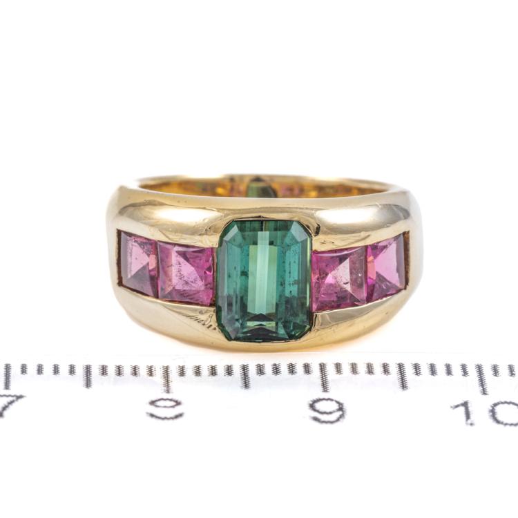 Tourmaline ring with a centre green emerald cut Natural Tourmaline of 1.89ct (note minor wear marks) and shoulder square cabochon cut pink natural Tourmaline totalling 1.35ct. 18ct yellow gold. Ring size K. Band width: 3.4mm-8.6mm. Weight: 10g. (Pre-owned)