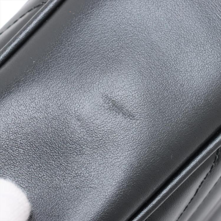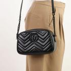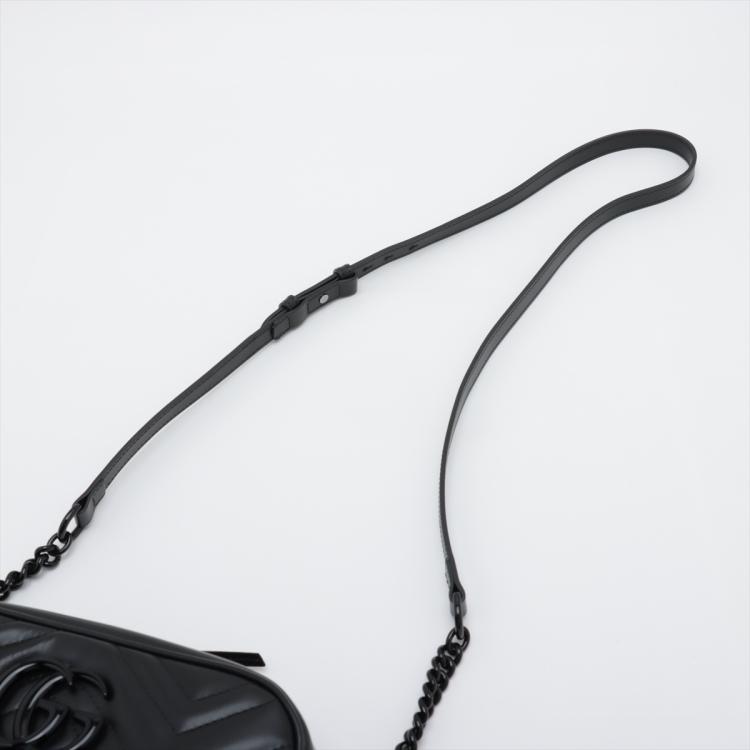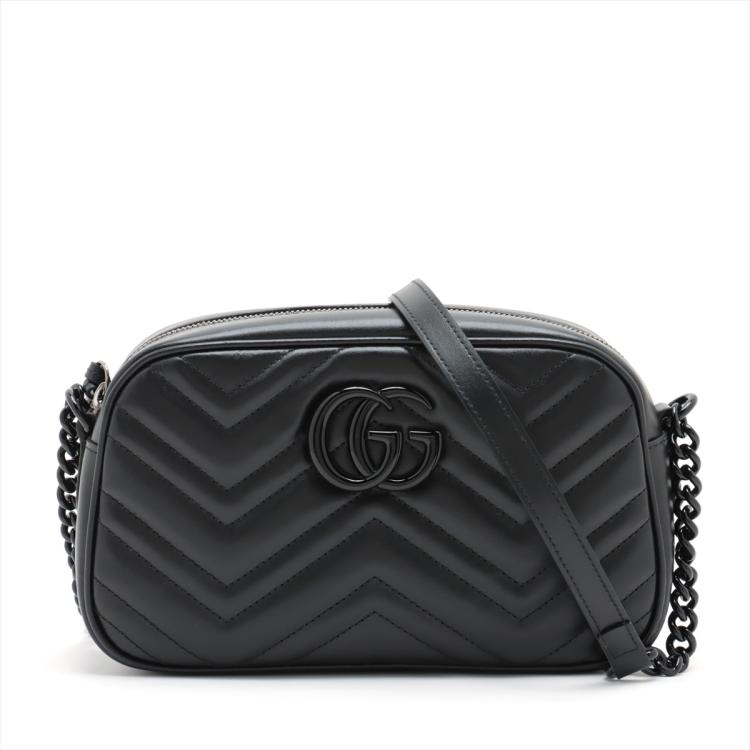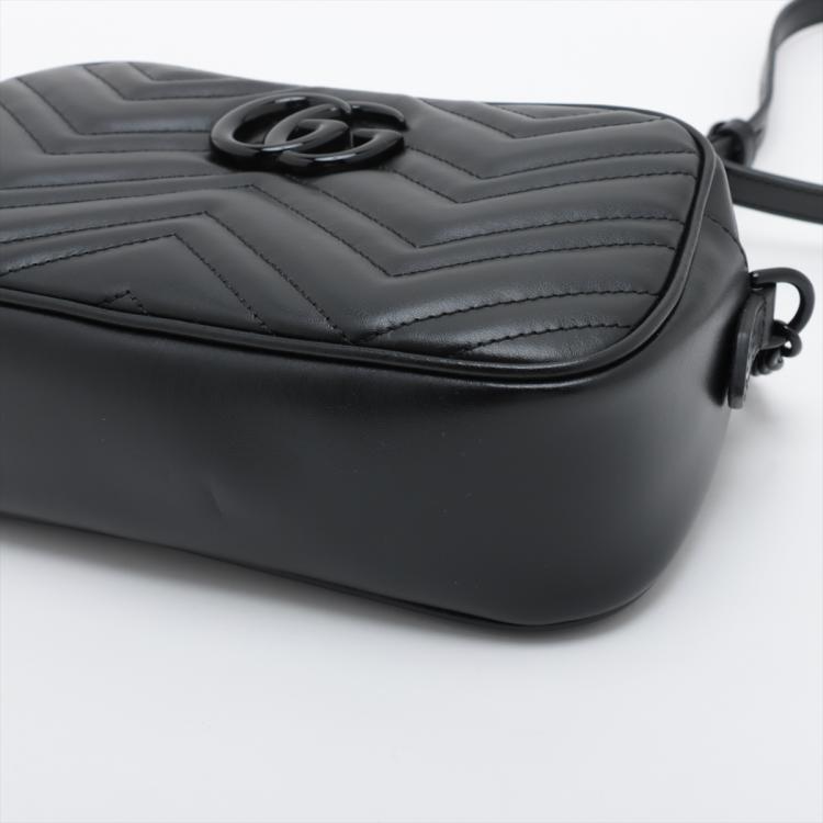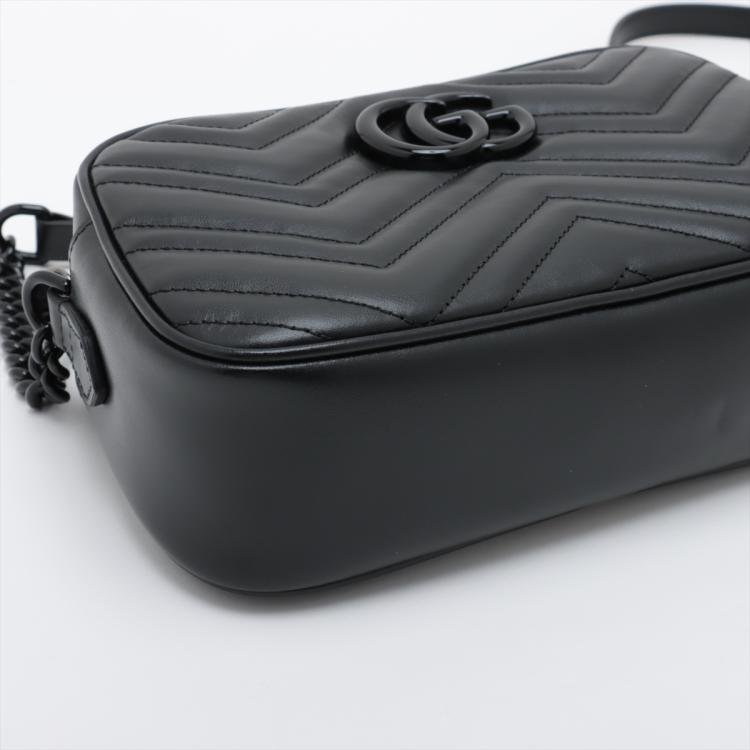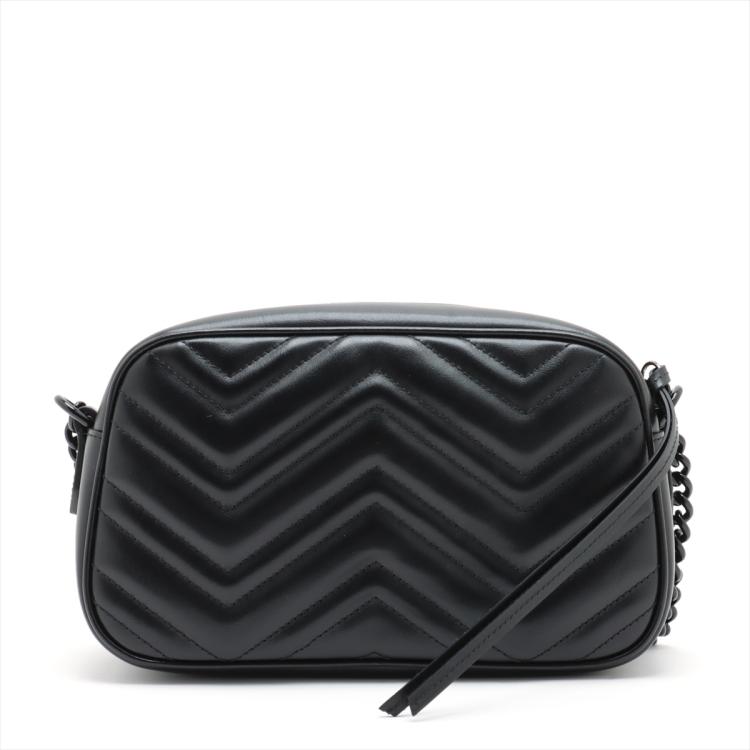 Gucci "All Black" GG Marmont small shoulder bag in black matelassé Chevron quilted leather. Featuring black brass hardware, GG hardware logo at front, and adjustable leather-chain shoulder strap. The zipper top opens to a black textile interior with a patch pocket. Approximate dimensions: 24cm(L) x 14cm(H) x 7.5cm(D), strap drop 59cm. Accompanied by a Gucci dustbag and box. With Entrupy Certificate of Authenticity. (Pre-owned)