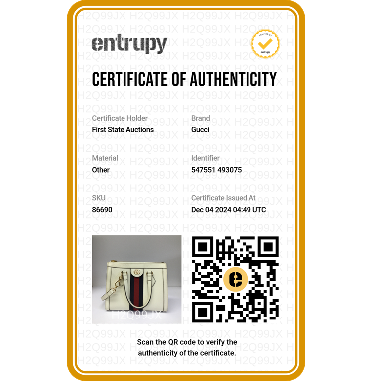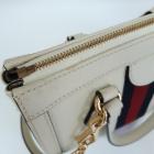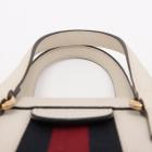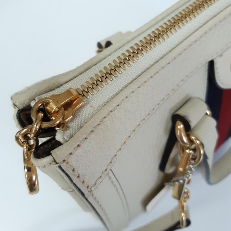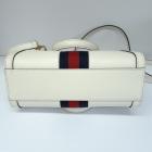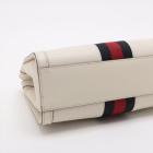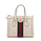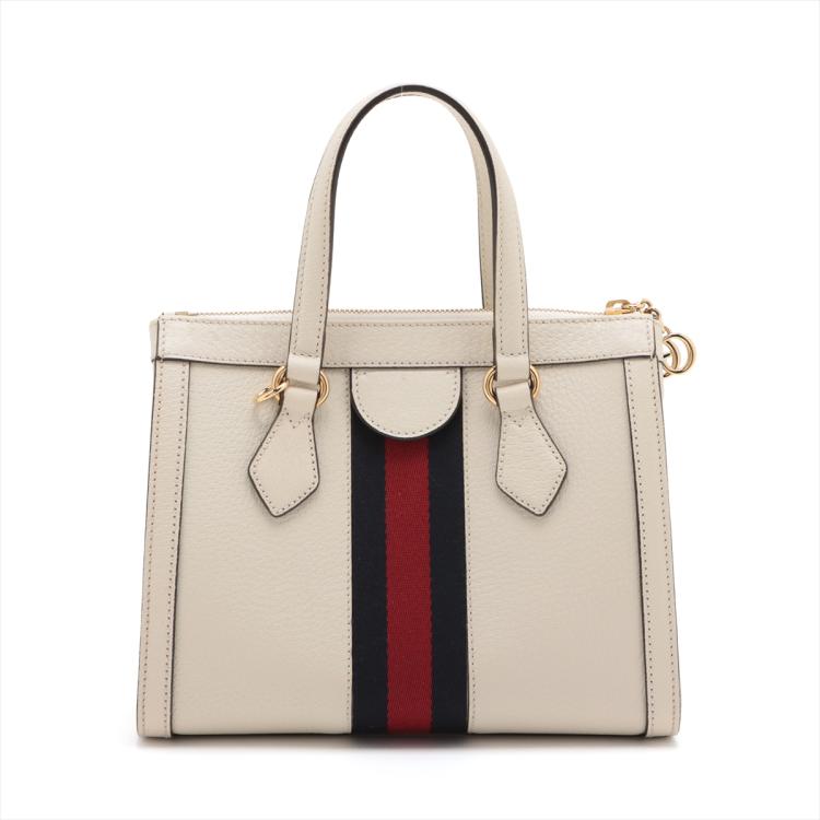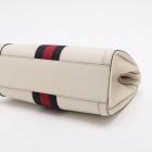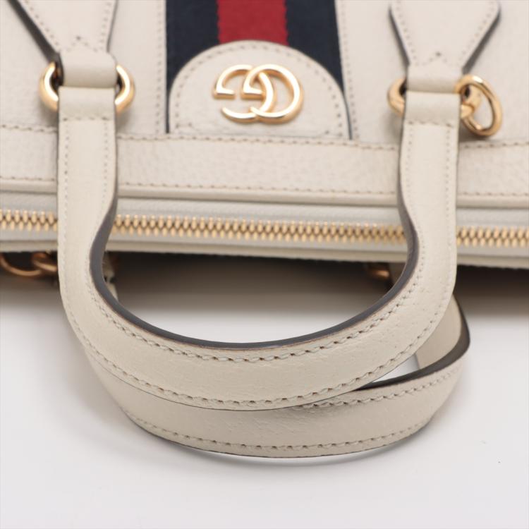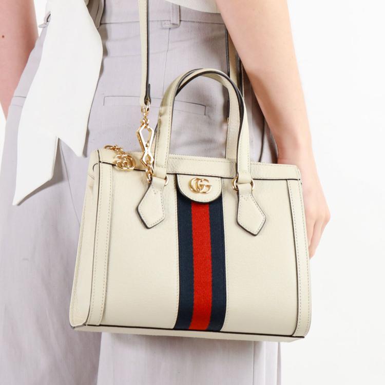 Gucci GG small Ophidia Web bag in white textured calfskin leather. Featuring gold-toned hardware, dual top flat handles, interlocking GG logo at front, and red and blue web stripe detail. The zipper top opens to a beige microfibre interior with a patch pocket. Approximate dimensions: 24cm(L) x 19cm(H) x 10.5cm(D), handle drop 10cm, detachable and adjustable shoulder strap drop 64cm. Accompanied by purchase receipt (01/20). With Entrupy Certificate of Authenticity. (Pre-owned)