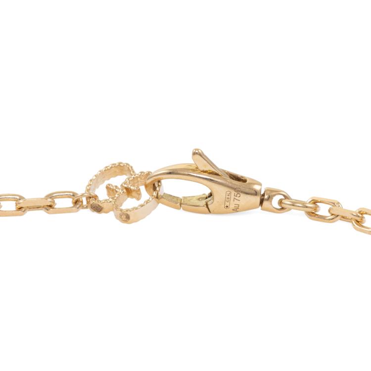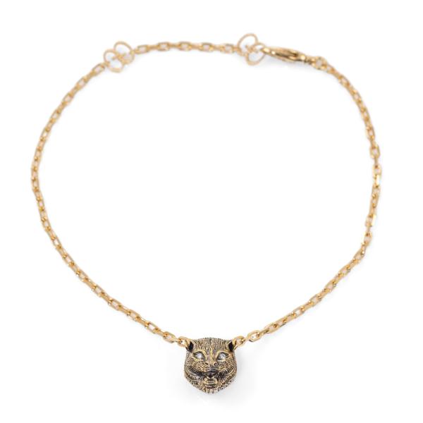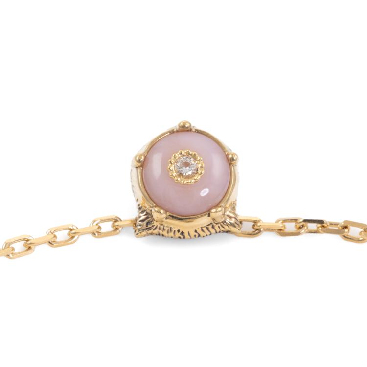 Gucci Le Marché Des Merveilles feline head, Pink Opal & Diamond reversible bracelet with round Natural Diamonds totalling approximately 0.03ct. Motif size: 11.3mm x 10.1mm. 18ct yellow gold. Length: 17.5 - max 20.0cm. Made in Italy. Weight: 5.8g. With Gucci box and pouch. (Pre-owned)