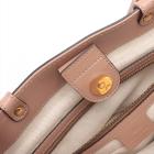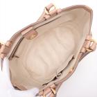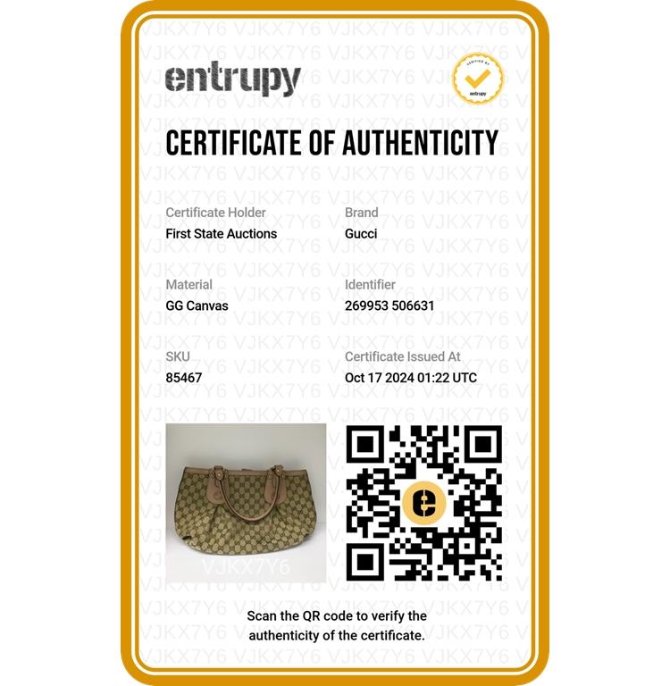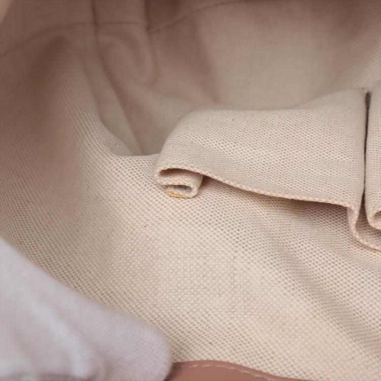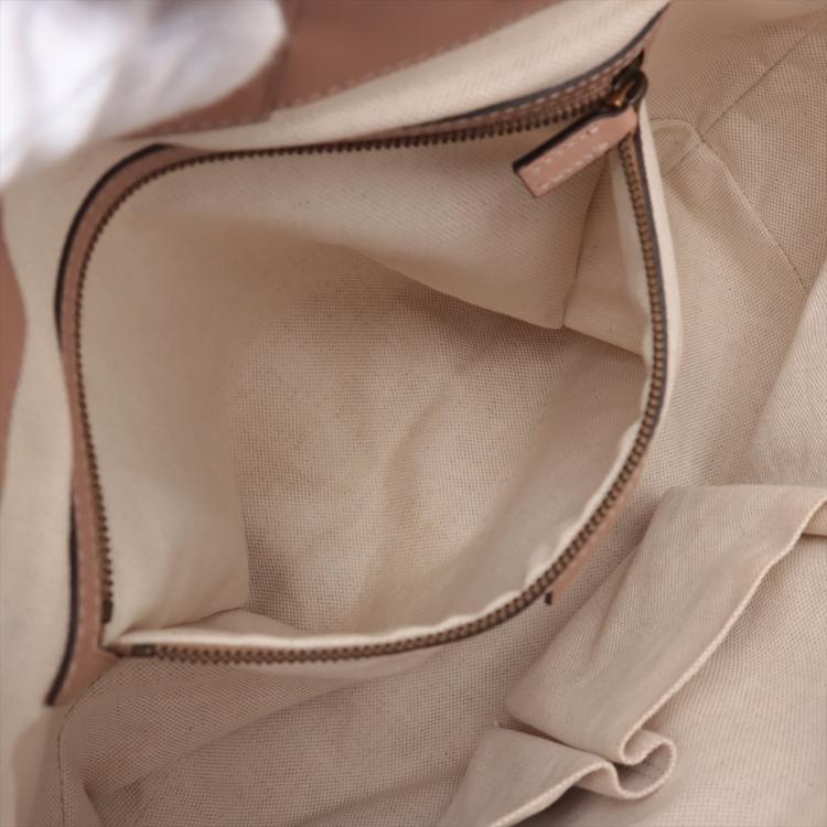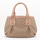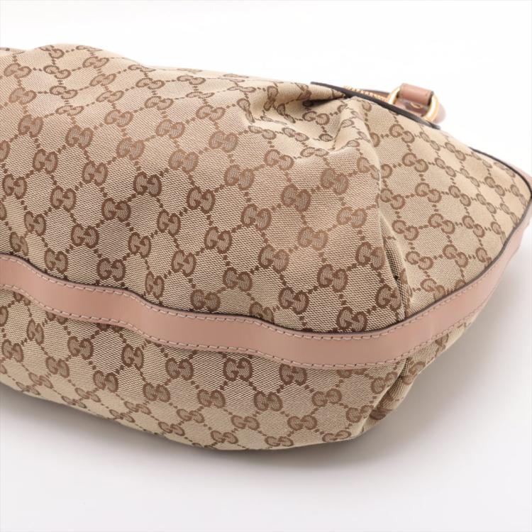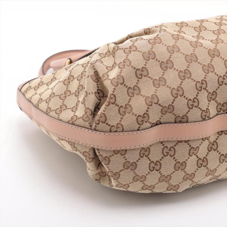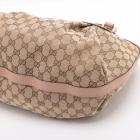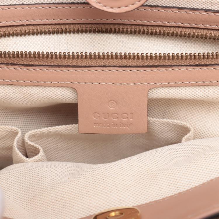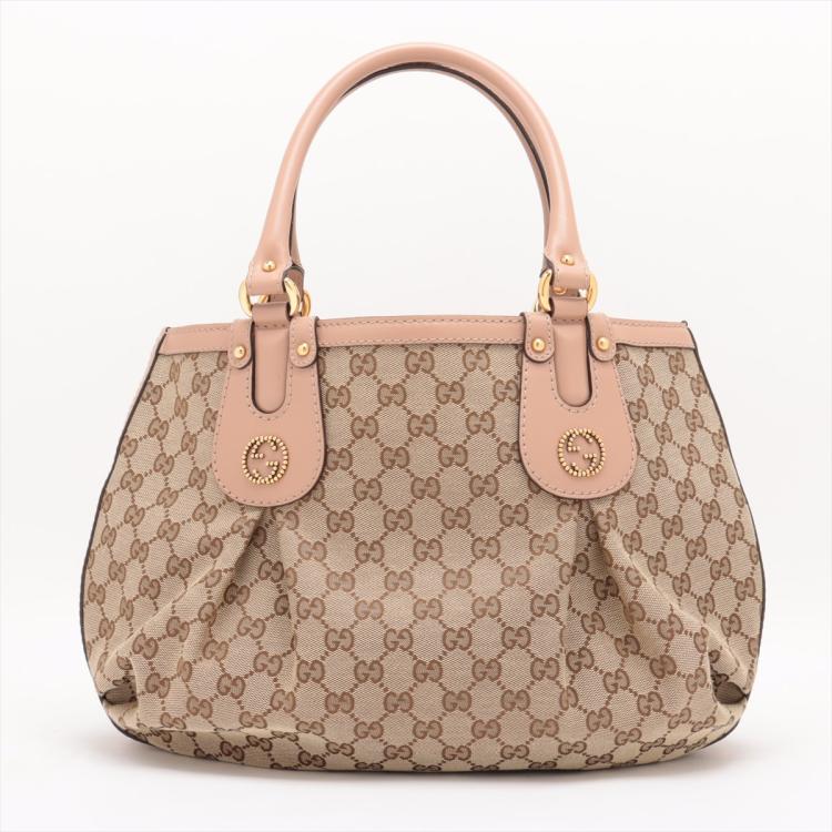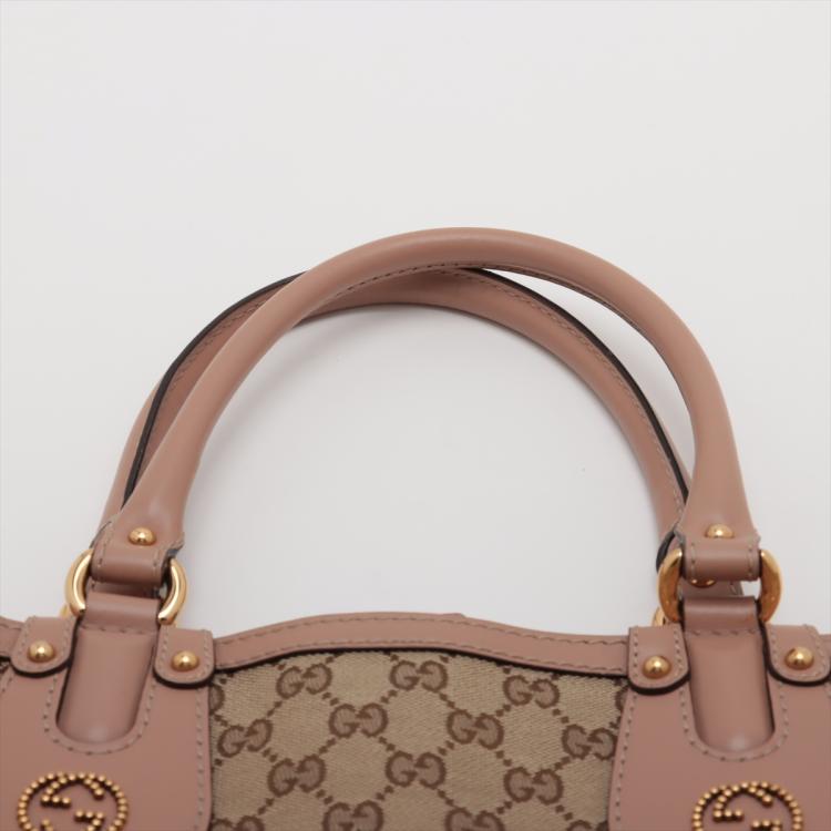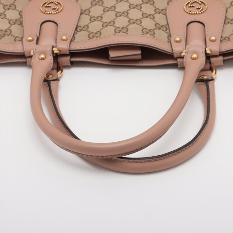 Gucci Scarlett handbag in GG monogram canvas and dusty pink leather trim. Featuring gold-toned hardware, gold studded GG logos, and dual rolled leather top handles. The magnetic button closure opens to a light beige textile interior with zipper and patch pockets. Approximate dimensions: 38cm(Base-L) x 23cm(H) x 13cm(D), handle drop 16.5cm. Accompanied by a Gucci dustbag. With Entrupy Certificate of Authenticity. (Pre-owned)