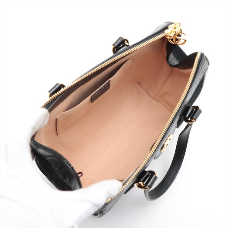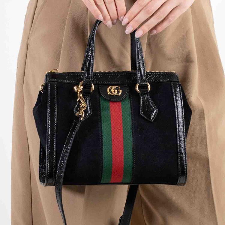 Gucci small Ophidia web tote in black suede. Featuring with shiny black leather trims and dual top handles, green & red web stripe details, gold-toned hardware, and a detachable and adjustable strap. The zip closure opens to a beige microfibre lining interior with a patch pocket. Approximate dimensions: 24cm(L) x 19.5cm(H) x 10.5cm(D), 10cm handle drop and 65.5cm strap drop. Accompanied by a Gucci dust bag. With Entrupy Certificate of Authenticity. (Pre-owned)