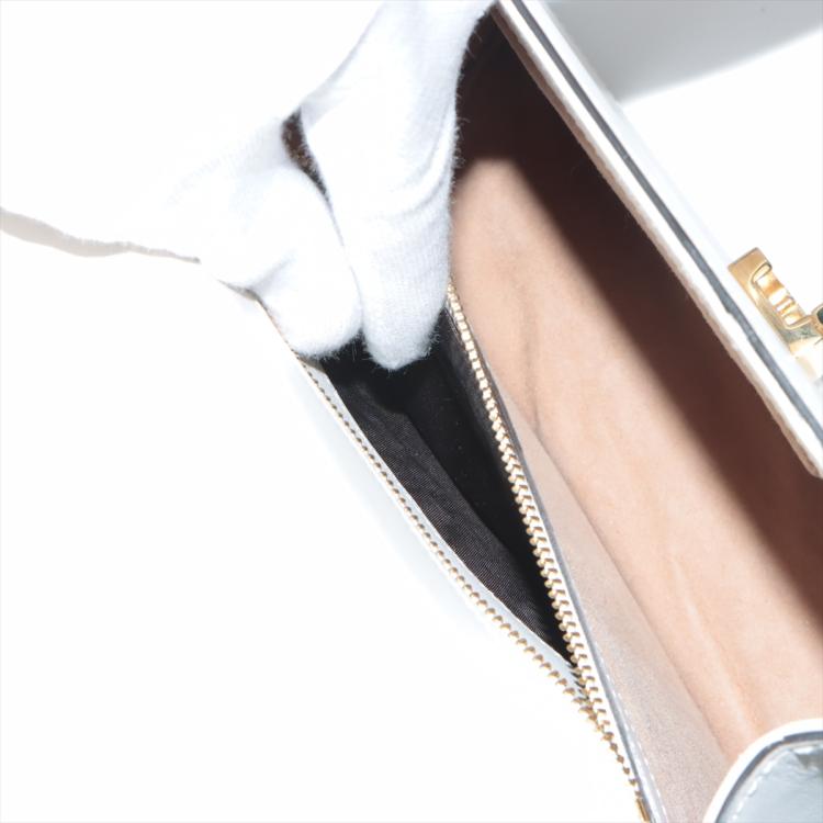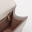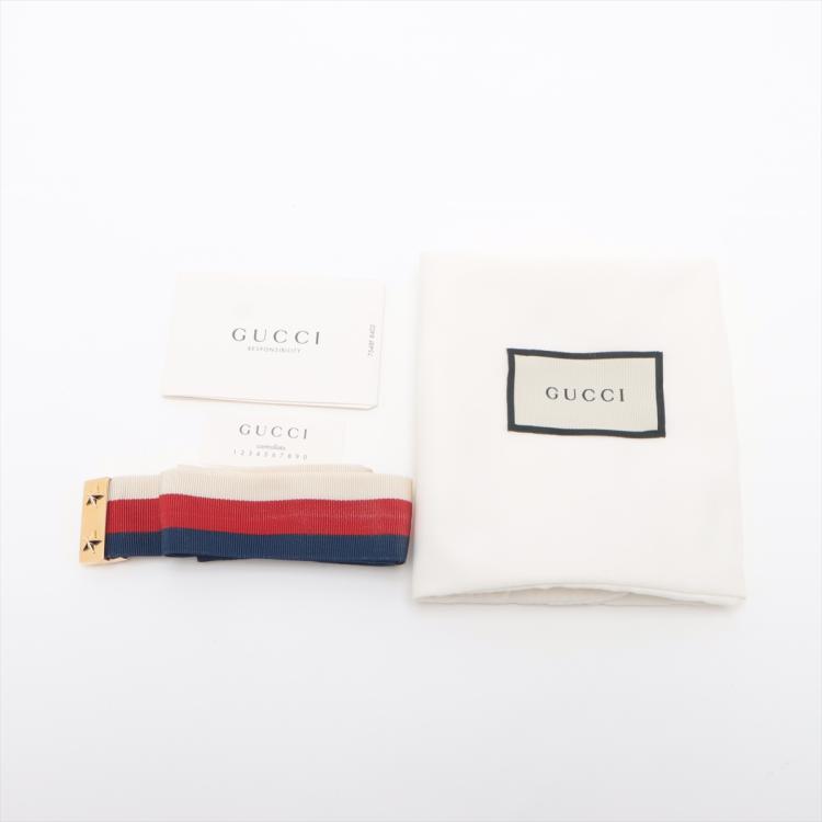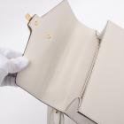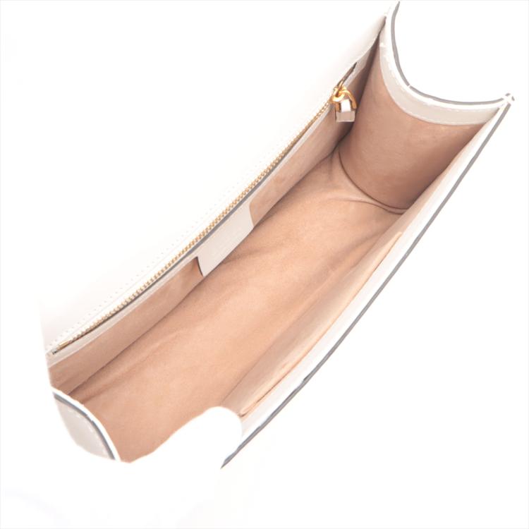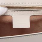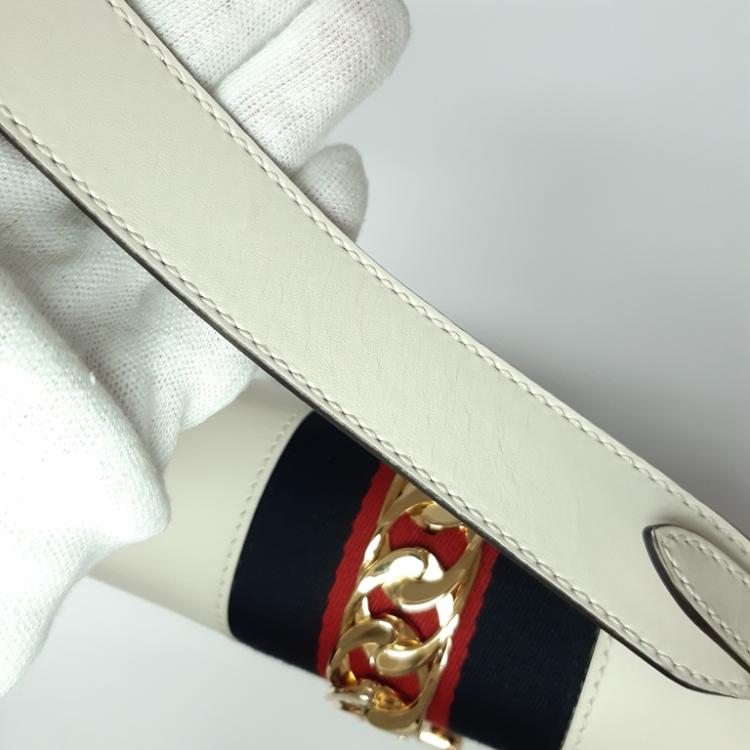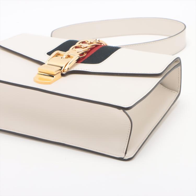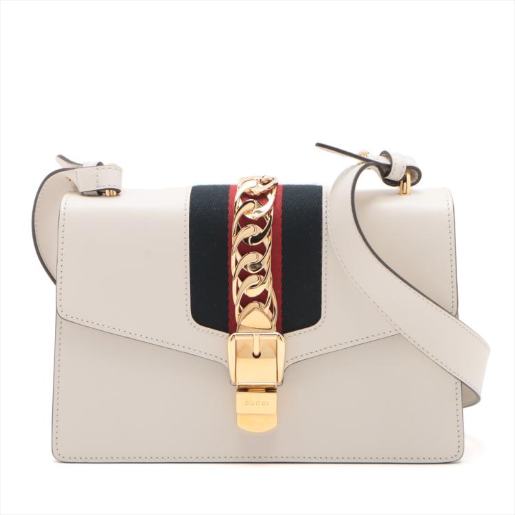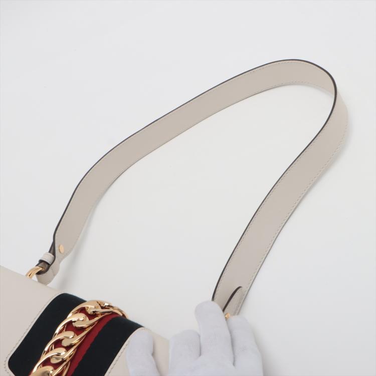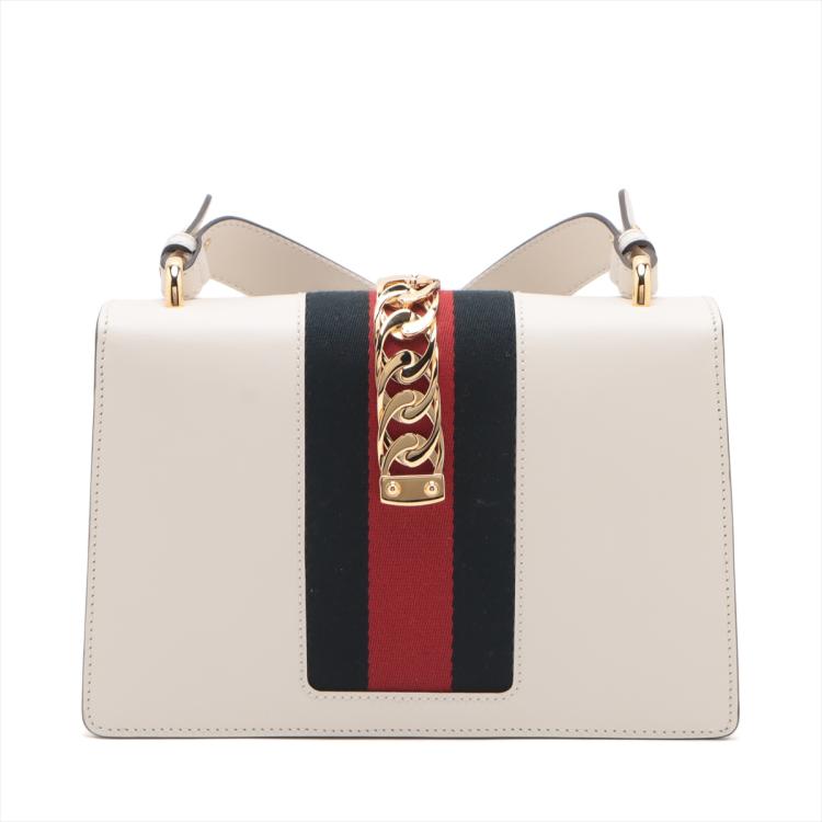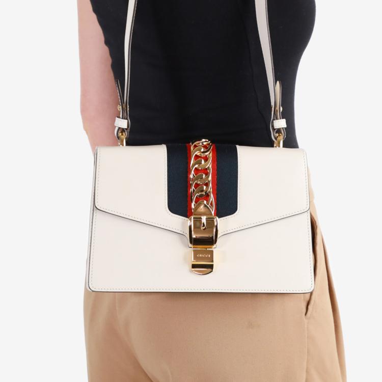 Gucci small Sylvie shoulder bag in off white calfskin leather. Featuring a front flap detailed with a central red and navy web stripe, a chain buckle lock closure at the front, gold-tone hardware. The flap opens to a microfiber lining interior with zipper and patch pockets. Approximate dimensions: 26cm(W) x 17cm(H) x 8cm(D), 35cm leather strap drop. Accompanied by striped ribbon. With Entrupy Certificate of Authenticity. (Pre-owned)