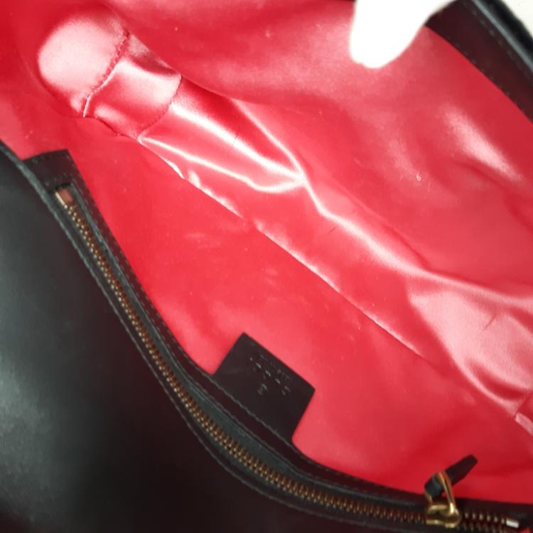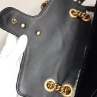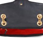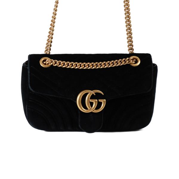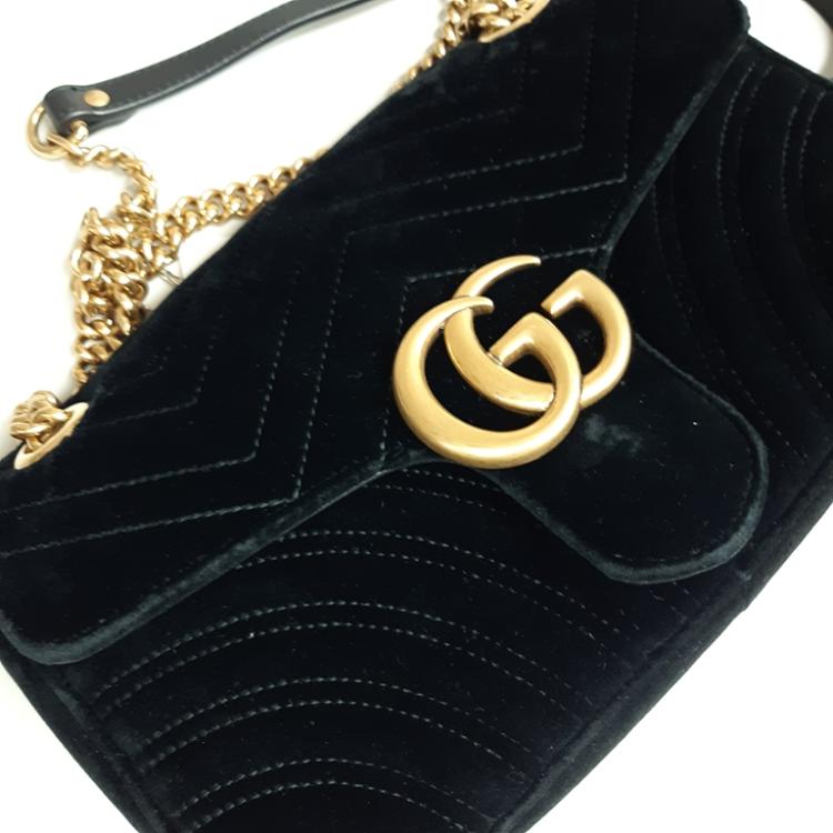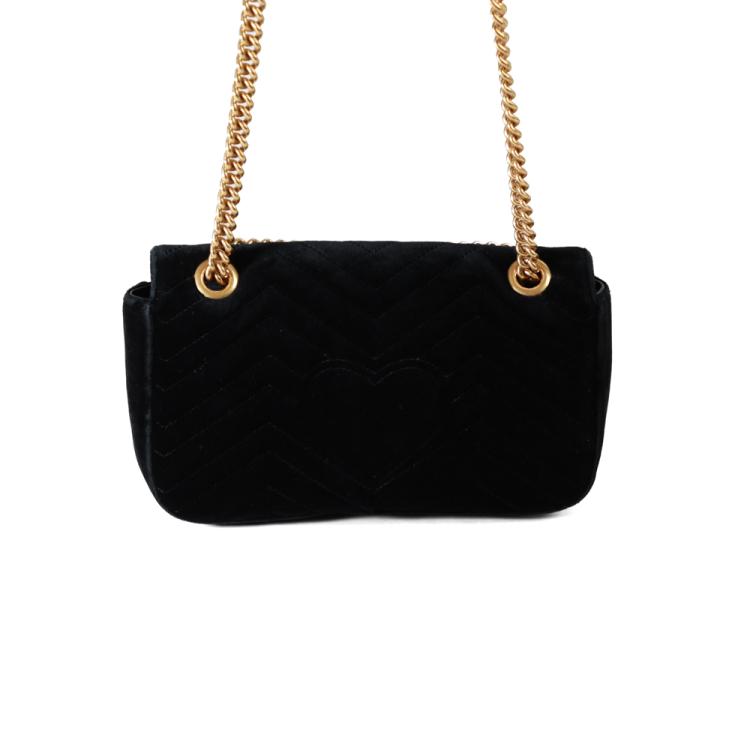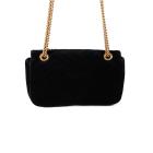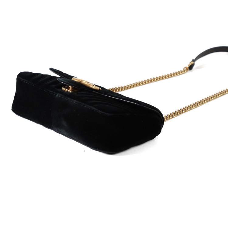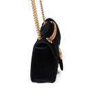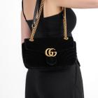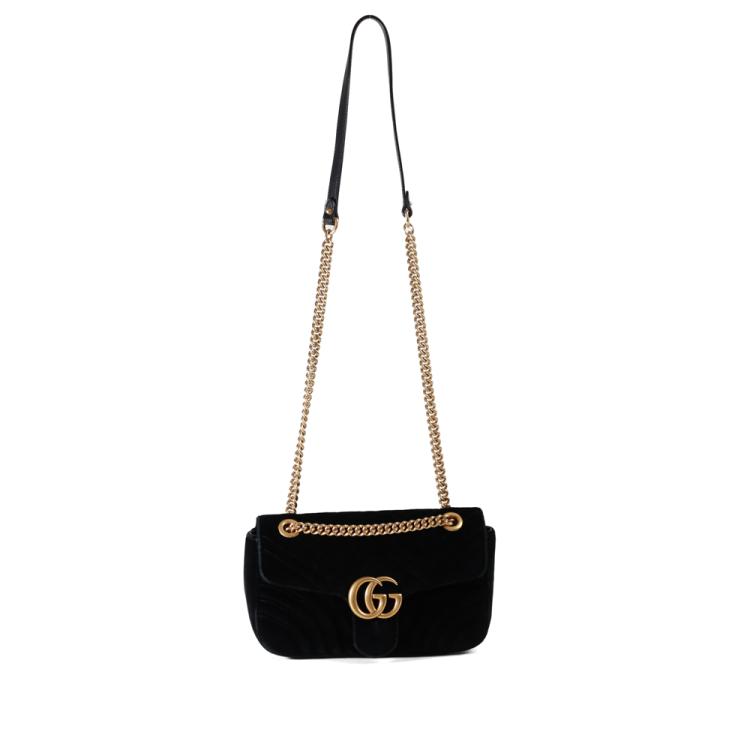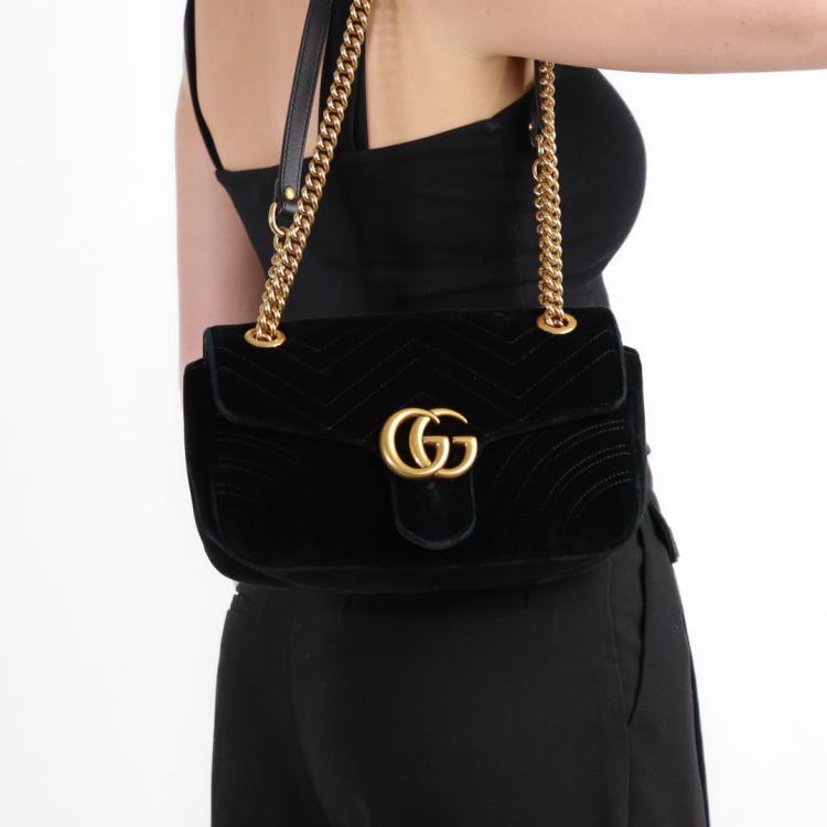 Gucci small GG Marmont Chain bag in black matelassé velvet exterior. Featuring antique gold-toned hardware, sliding chain shoulder strap, and front flap with interlocking GG logo. The push-lock closure opens to a bright pink satin interior with a zipper pocket. Approximate dimensions: 25cm(L) x 15cm(H) x 7cm(D), strap drop 56cm. Accompanied by Gucci dustbag. With Entrupy Certificate of Authenticity. (Pre-owned)