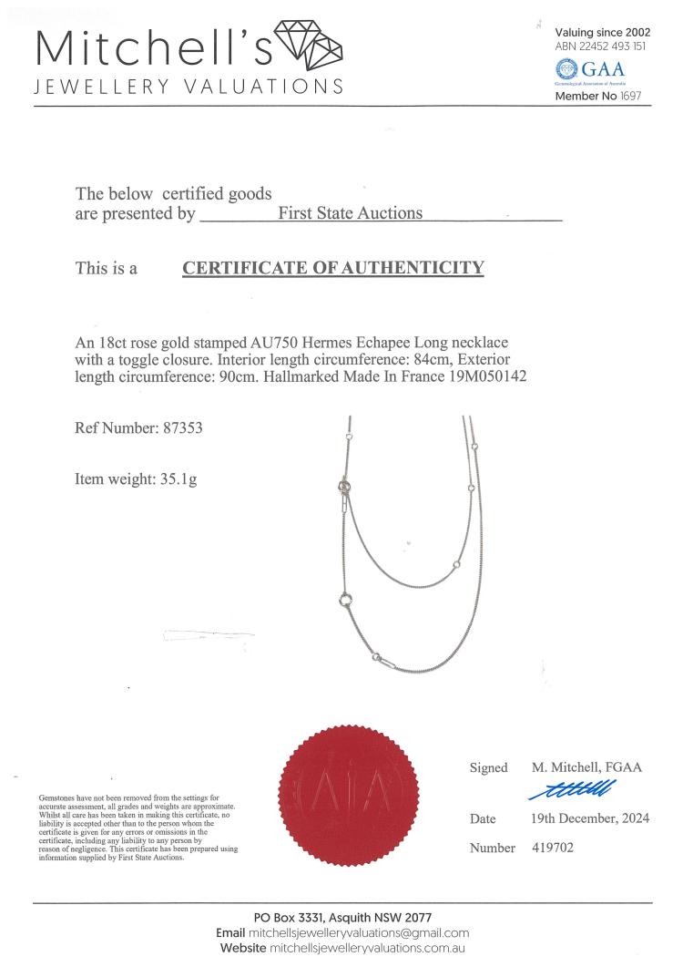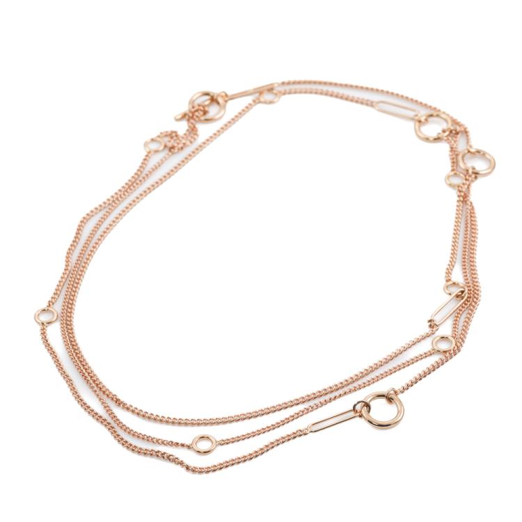 Hermes Echapee Long necklace with toggle closure, can be worn as a single, wrap around or lariat necklace for different looks. 18ct rose gold. Interior length circumference: 84.0cm. Exterior length circumference: 90.0cm. Made in France. Weight: 35.1g. With Certificate #419702. (Pre-owned)