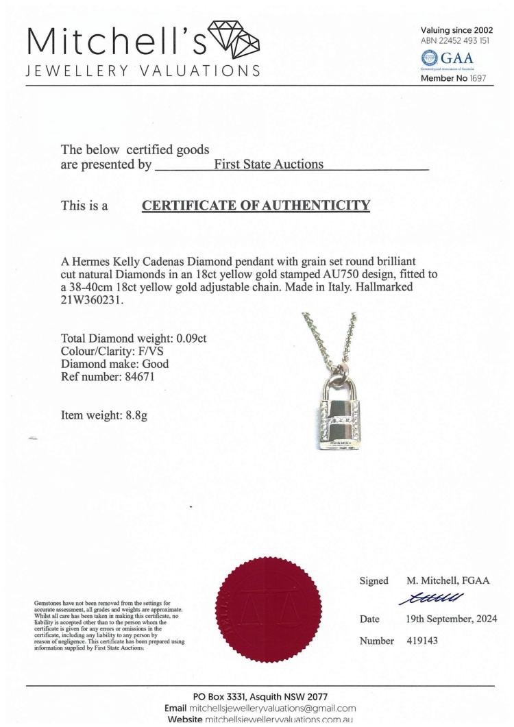 Hermes Kelly Cadenas pendant with round natural Diamonds totalling 0.09ct. Motif size: 16.5mm x 8.2mm. 18ct yellow gold with 18ct yellog gold Hermes adjustable 38-40cm chain. Made in France. Weight: 8.9g. With Hermes box. With Certificate #419143. (Pre-owned)