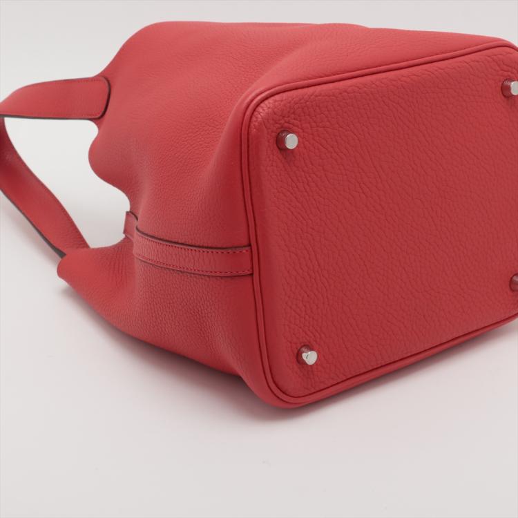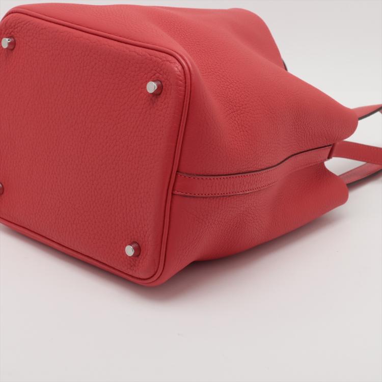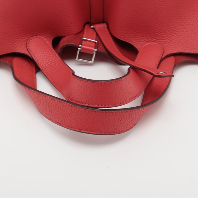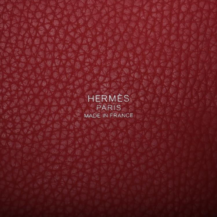 Hermes Picotin Lock MM in Rouge Taurillon Clemence leather ("R in square" stamp, circa:2014). Featuring silver toned hardware, leather top handles, opening top with strap closure. The top opens to a suede lining interior with leather bottom. Approximate dimensions: 22cm(L) x 22cm(H) x 17.5cm(D), 15cm handle drop. Accompanied by Hermes padlock, one key, dust bag and box. With Entrupy Certificate of Authenticity. (Pre-owned)