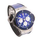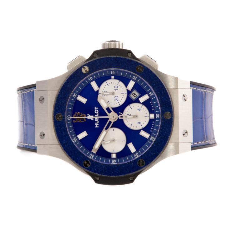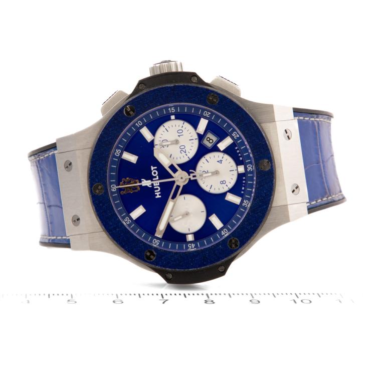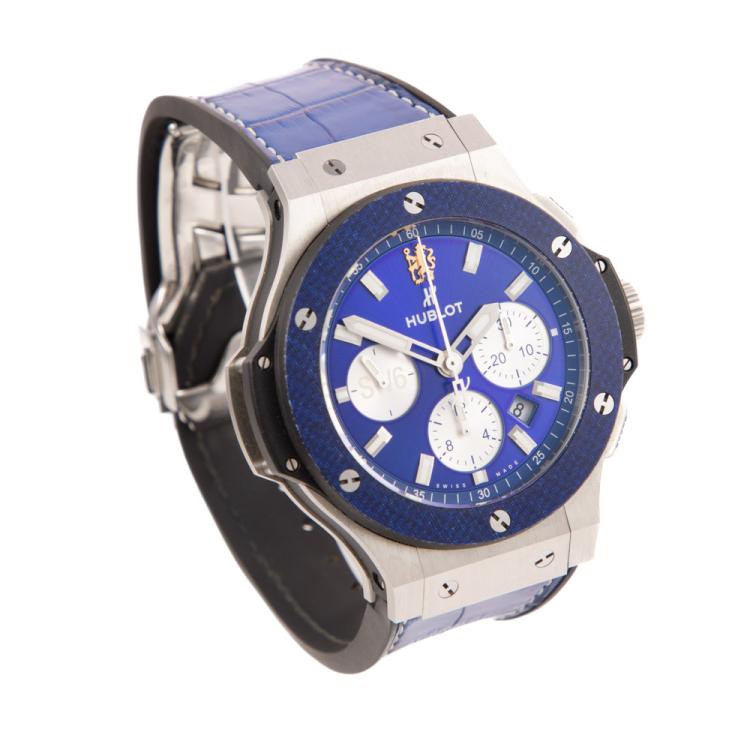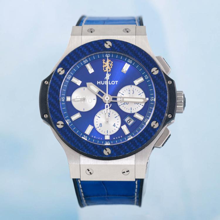 Hublot Big Bang Chelsea Football Club Limited Edition of 200 stainless steel and titanium automatic mens watch. Blue chronograph dial, date, case diameter: 44mm, adjustable max wrist size: 19cm, Swiss made. Ref# 301.SY.7129.LR.CFC17. With Hublot blue leather/rubber strap & clasp. With Certificate of Authenticity, Hublot International Warranty card dated 13/11/2018, Chelsea 2017-2018 Home Football Shirt and Hublot box. 3 month FSA warranty (Pre-owned).