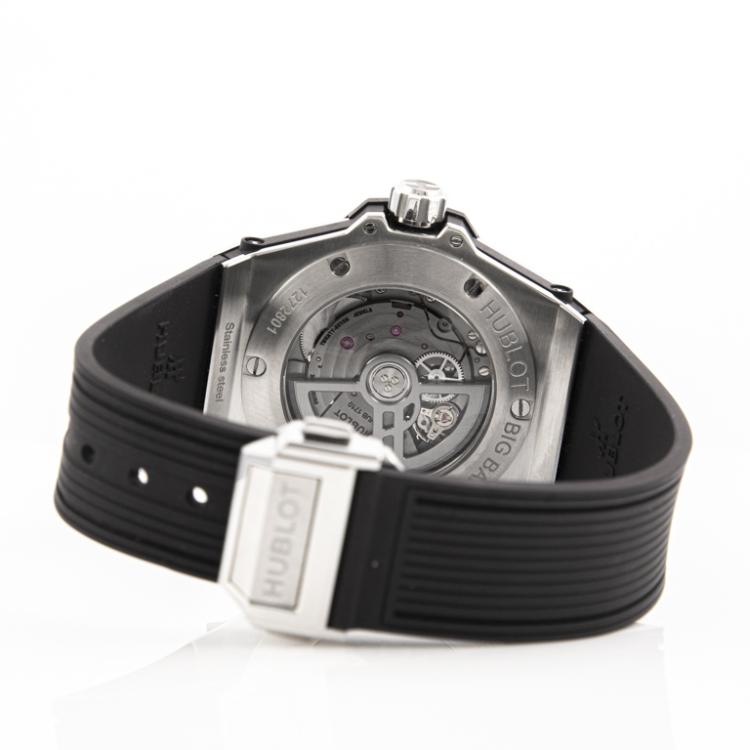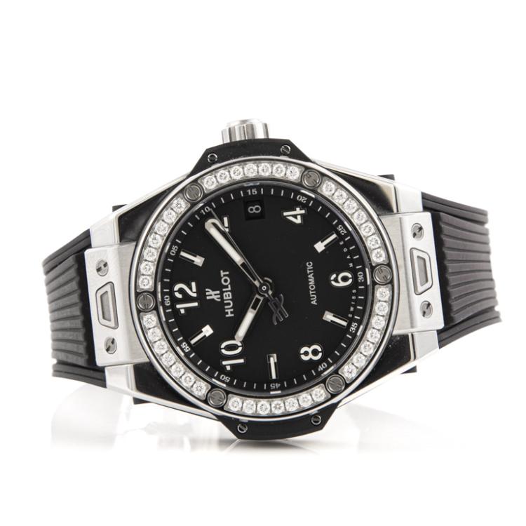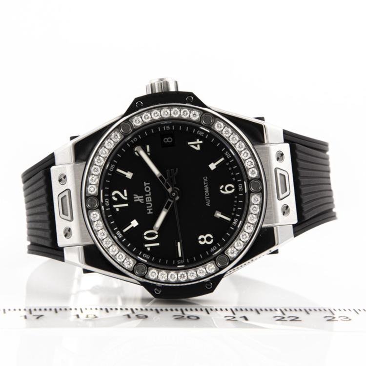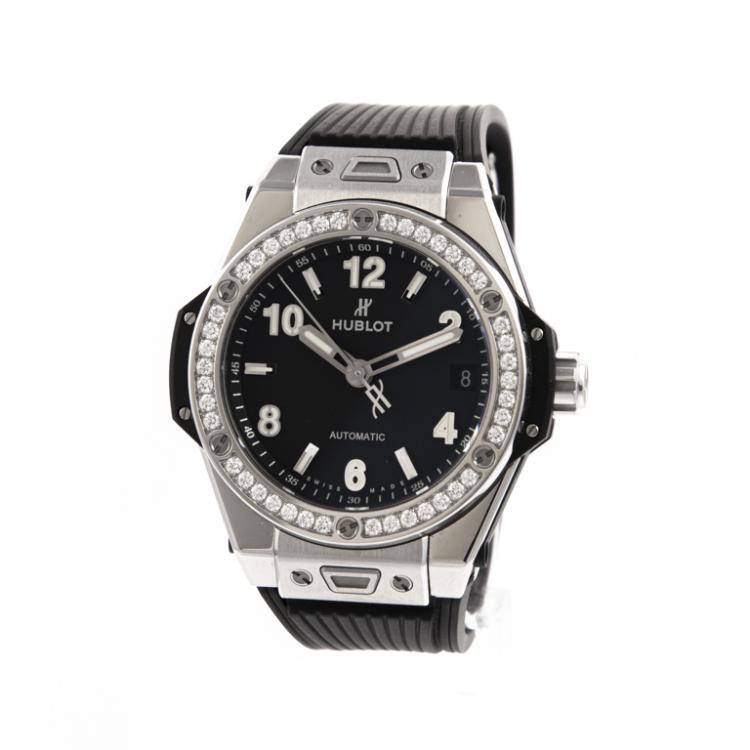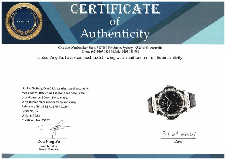 Hublot Big Bang One Click stainless steel automatic mens watch. Black dial, Diamond set bezel, date, case diameter: 39mm, adjustable max wrist size: 17.5cm, Swiss made. Re#465.SX.1170.RX.1204. With Hublot black rubber strap and clasp. With Certificate of Authenticity, Kamine Free Maintenance card dated 18/11 and Hublot box. 3 month FSA warranty (Pre-owned)