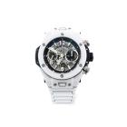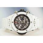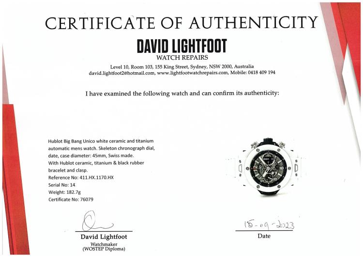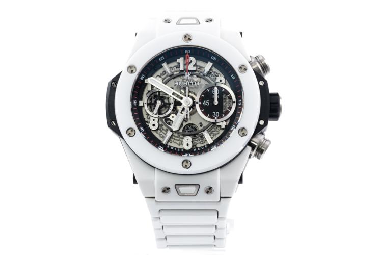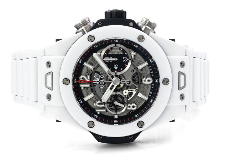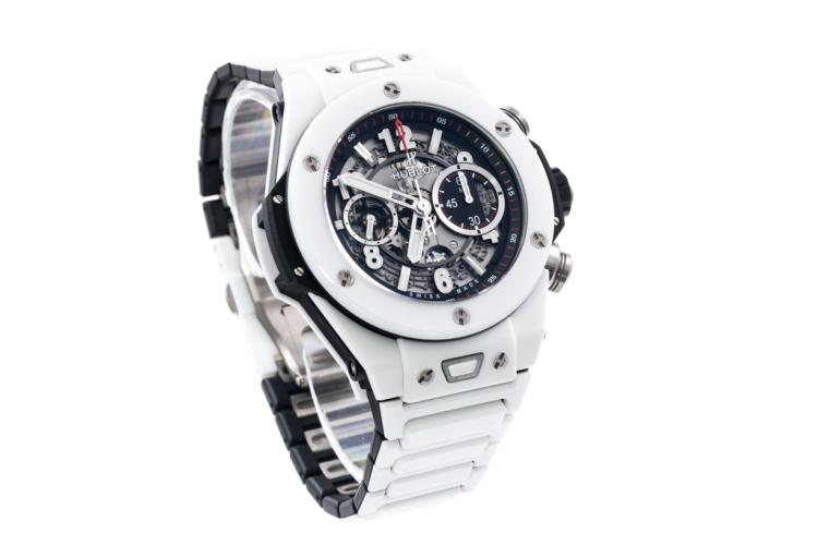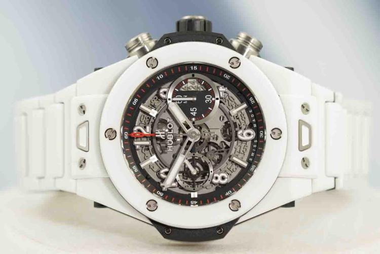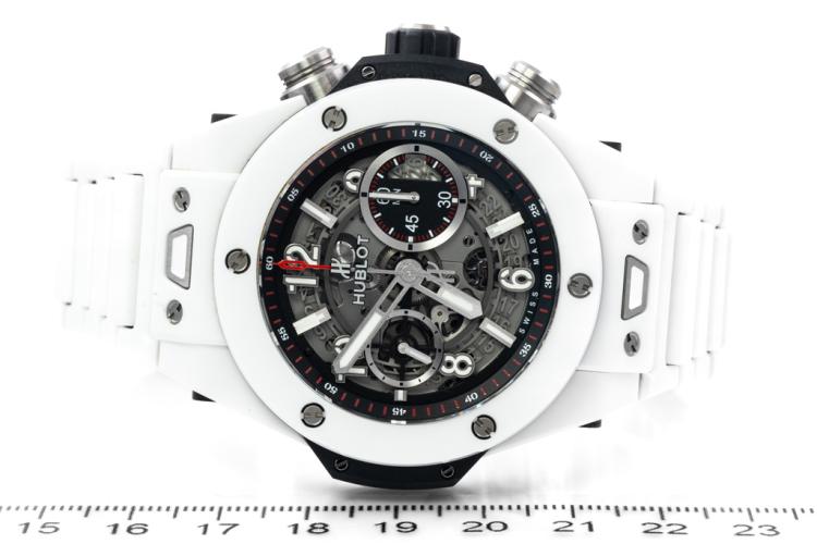 Hublot Big Bang Unico white ceramic and titanium automatic mens watch. Skeleton chronograph dial, date, case diameter: 45mm, wrist size: 21cm, Swiss made. Ref# 411.HX.1170.HX. With Hublot ceramic, titanium & black rubber bracelet and clasp. With Certificate of Authenticity, Undated Hublot International Warranty Card and Hublot box. 3 month FSA warranty. (Pre-owned)