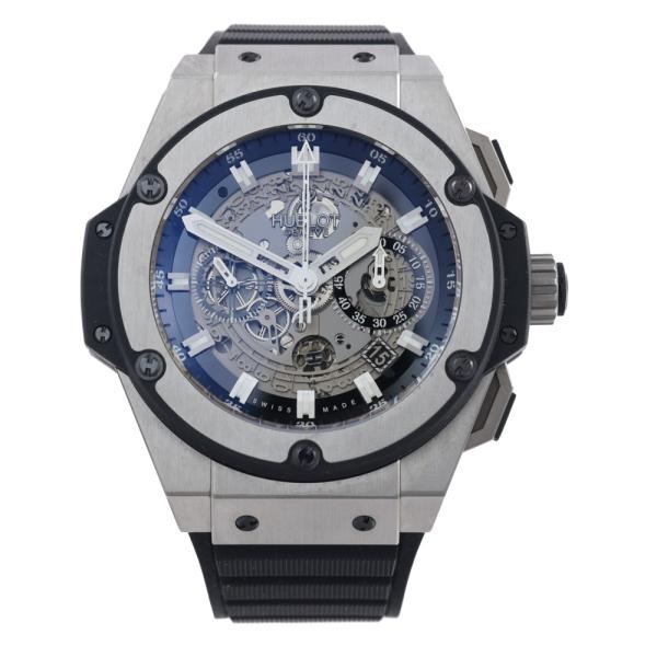 Hublot King Power Unico titanium automatic mens watch. Skeleton chronograph dial, date, case diameter: 48mm, adjustable max wrist size: 19.5cm, Swiss made. Ref #701.NX.0170.RX. With Hublot black rubber strap and clasp. With Certificate of Authenticity and Hublot box. 3 month FSA warranty (Pre-owned)