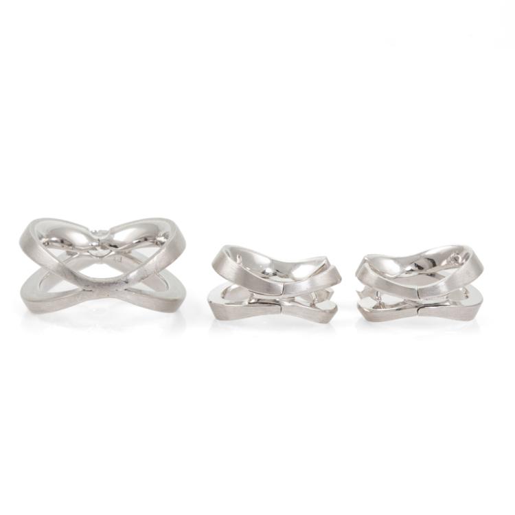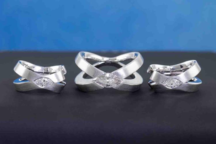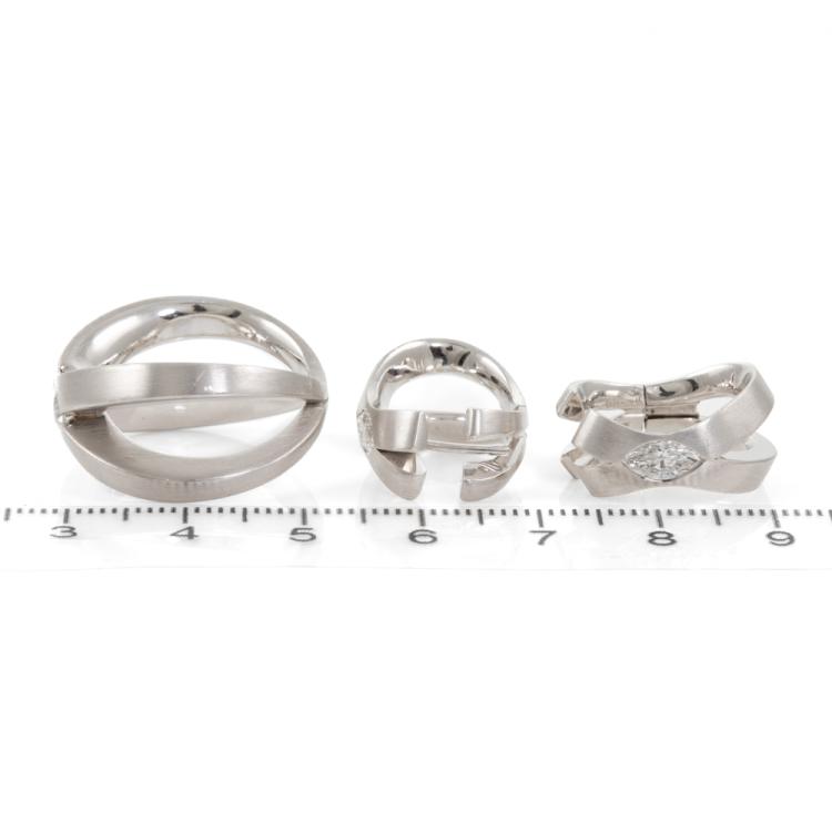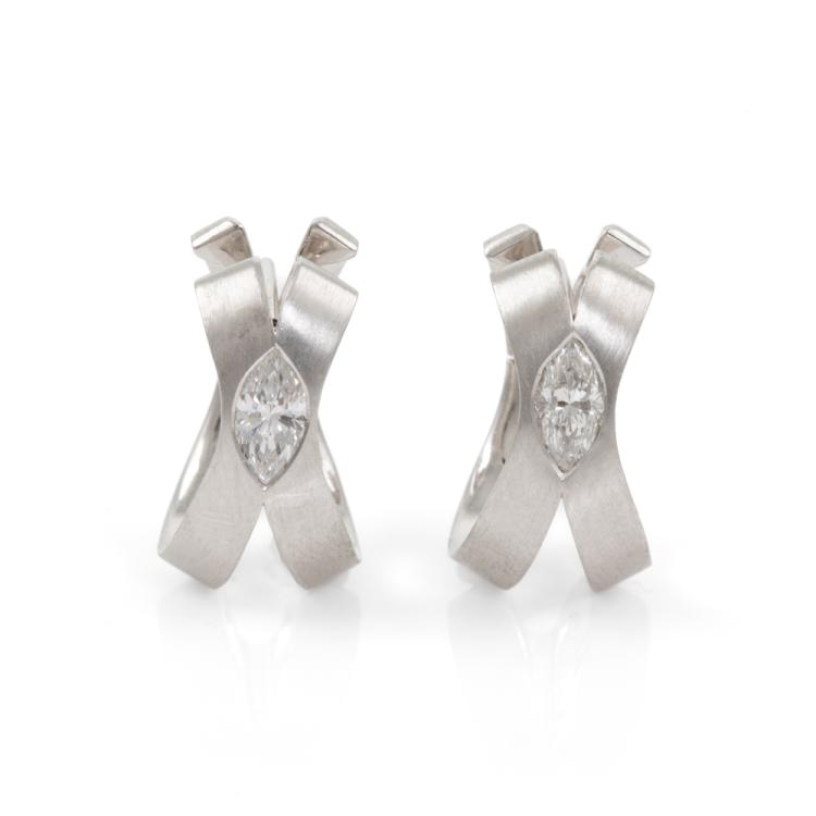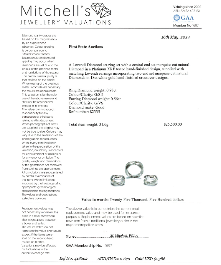 Levendi Millennium ring and earrings set. 1) Ring with a marquise cut natural Diamond of 0.93ct (Estimated grading: G SI). Platinum 950 XRF tested, stamped "Pt"). Ring size P - ring resizing is not recommended. Minimum band width: 2.7mm. 2) Matching earrings with marquise cut natural Diamonds totalling approximately 0.56cts (Estimated grading: G VS). 18ct white gold. Total Weight: 31.6g. With Valuation Certificate #418662. (Pre-owned)