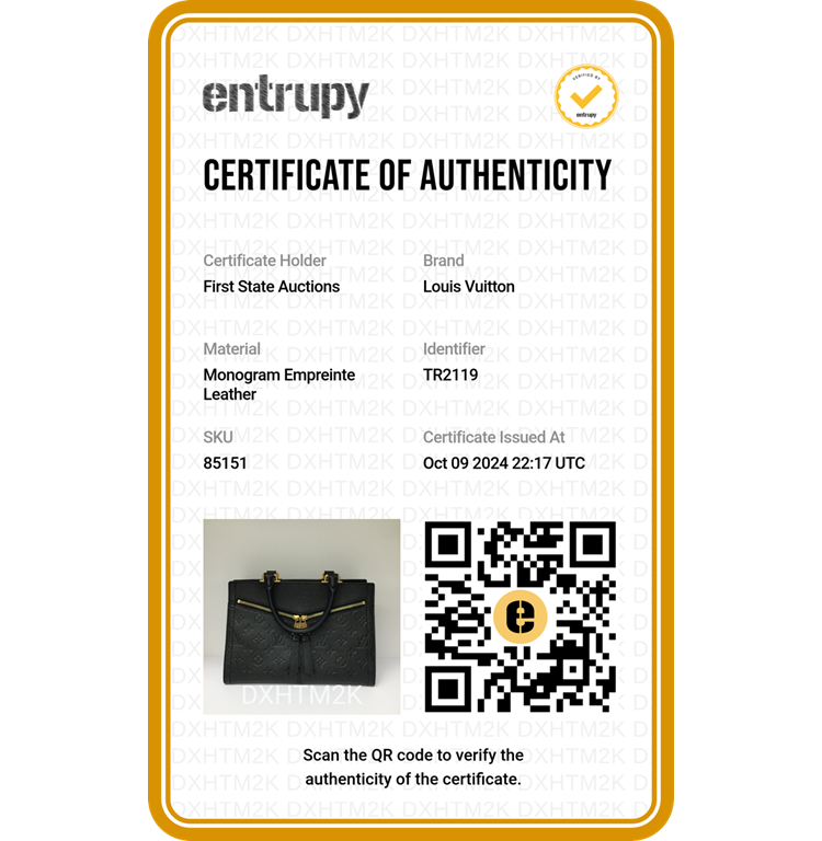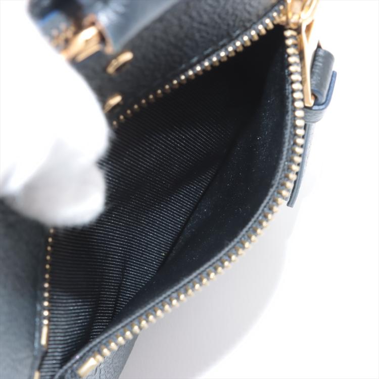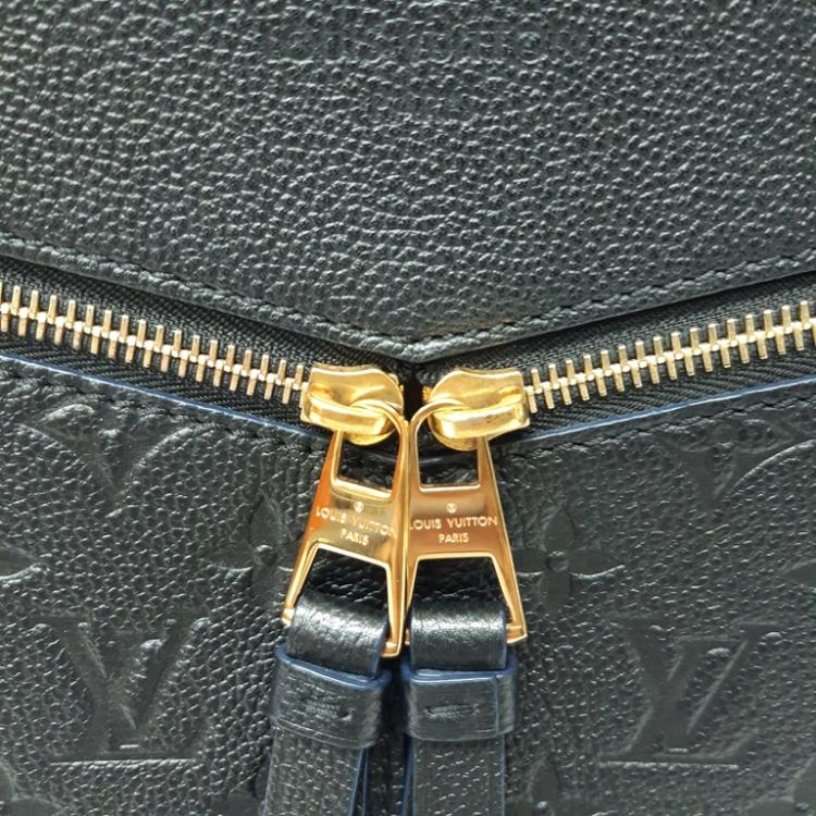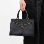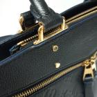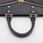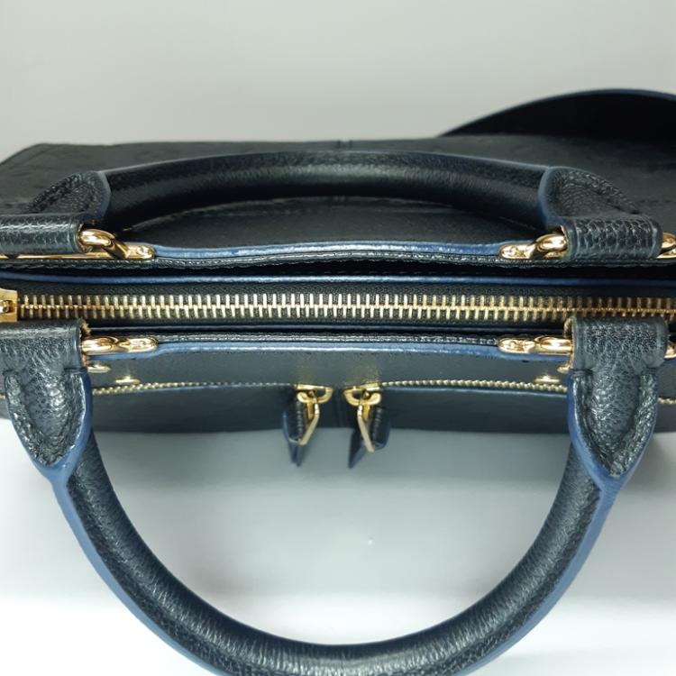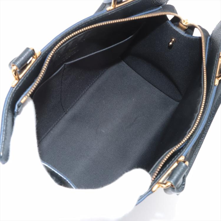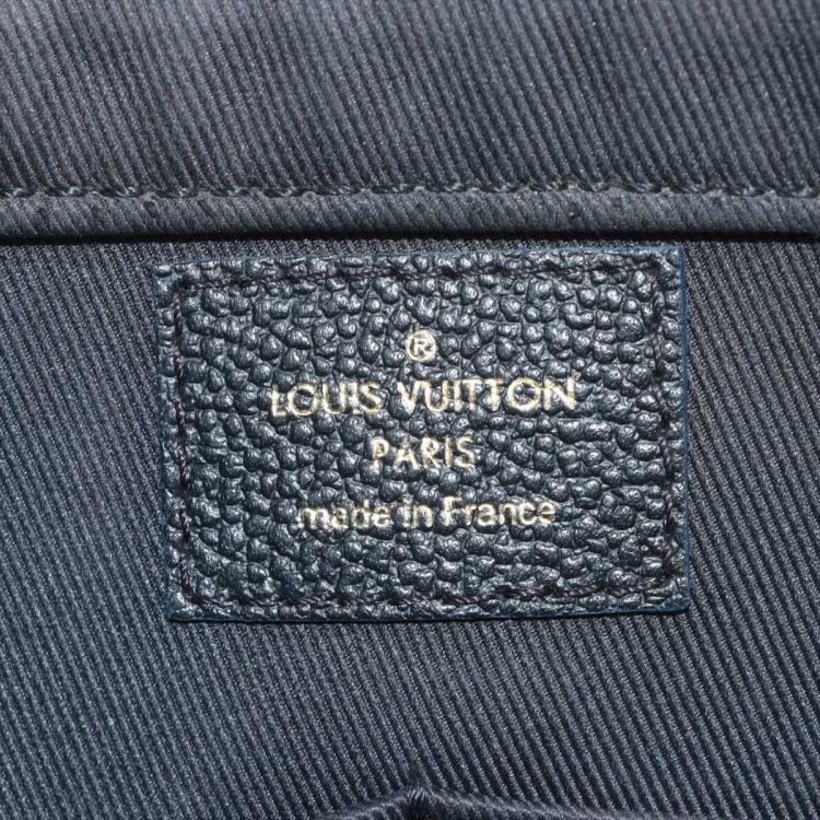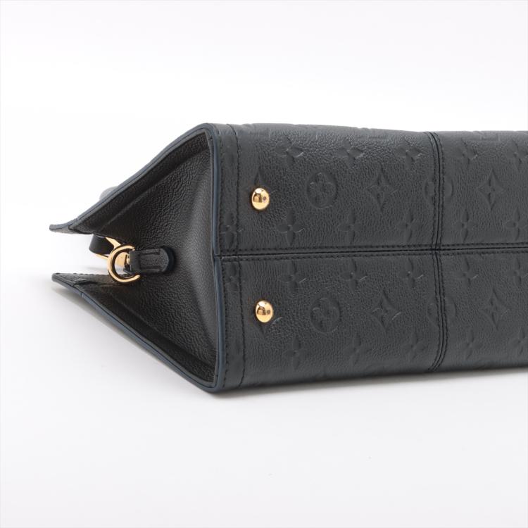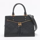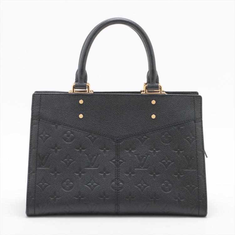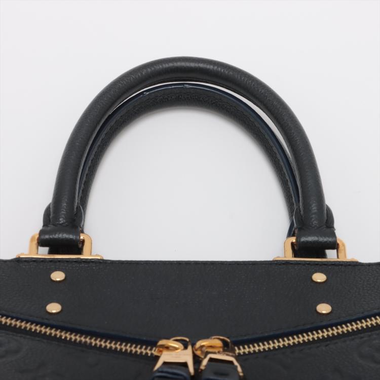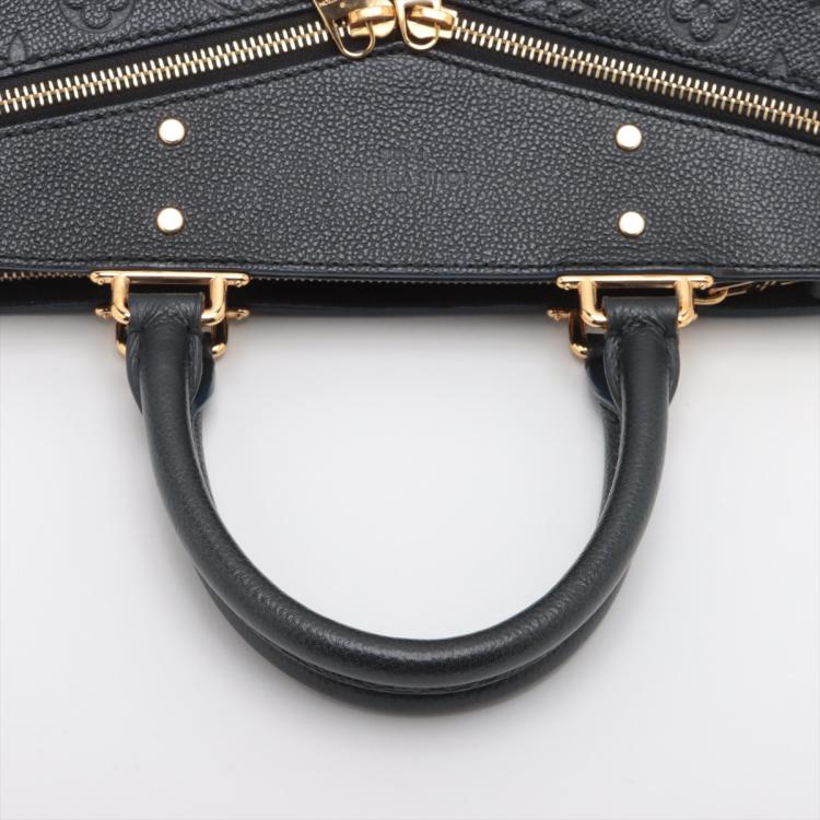 Louis Vuitton Empreinte Sully PM in black Monogram Empreinte leather, with navy blue leather trims. Featuring gold-toned hardware, twin front zip pockets, double rolled handles, and a detachable flat shoulder strap. The zipper closure opens to black textile interior with two patch pockets. Approx dimensions: 29.5cm(Base-L) x 19.5cm(H) x 14cm(D), handle drop 12cm, strap drop 50cm. Accompanied by LV dustbags and box. With Entrupy Certificate of Authenticity. (Pre-owned)