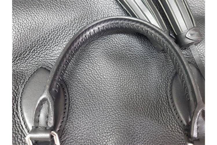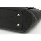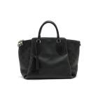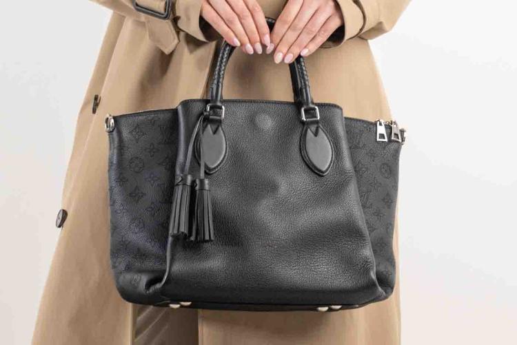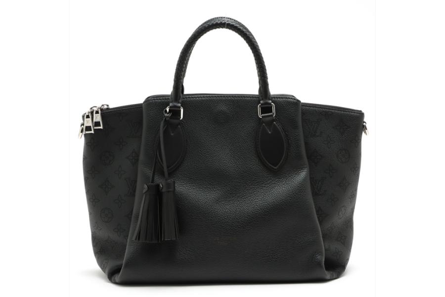 Louis Vuitton Haumea in black Mahina and grained leather. Featuring silver toned hardware, braided top leather handles, dual exterior pockets with magnetic closures, removable tassel accents, zip closure on top. This opens to a microfiber lining interior with patch pockets. Approximate dimensions: 34.5cm(L) x 24cm(H) x 11.5cm(D), 9cm handle drop and 54cm(max) adjustable & removable strap. With Entrupy Certificate of Authenticity. (Pre-owned)