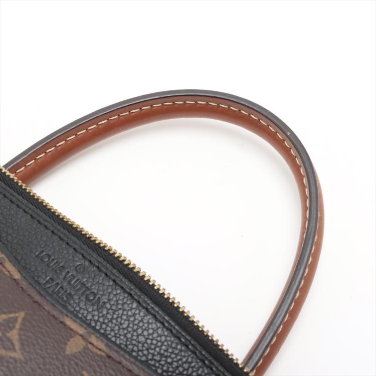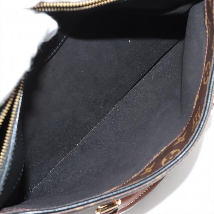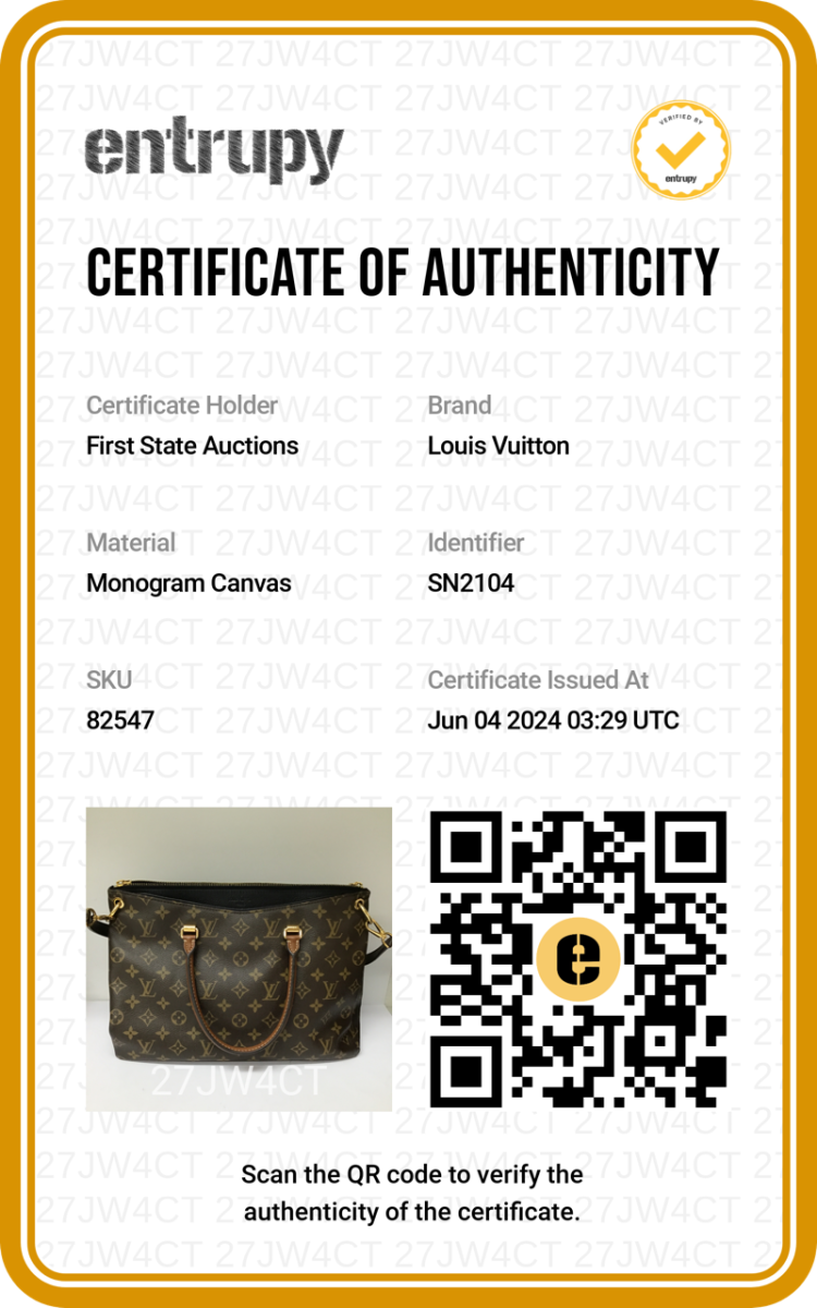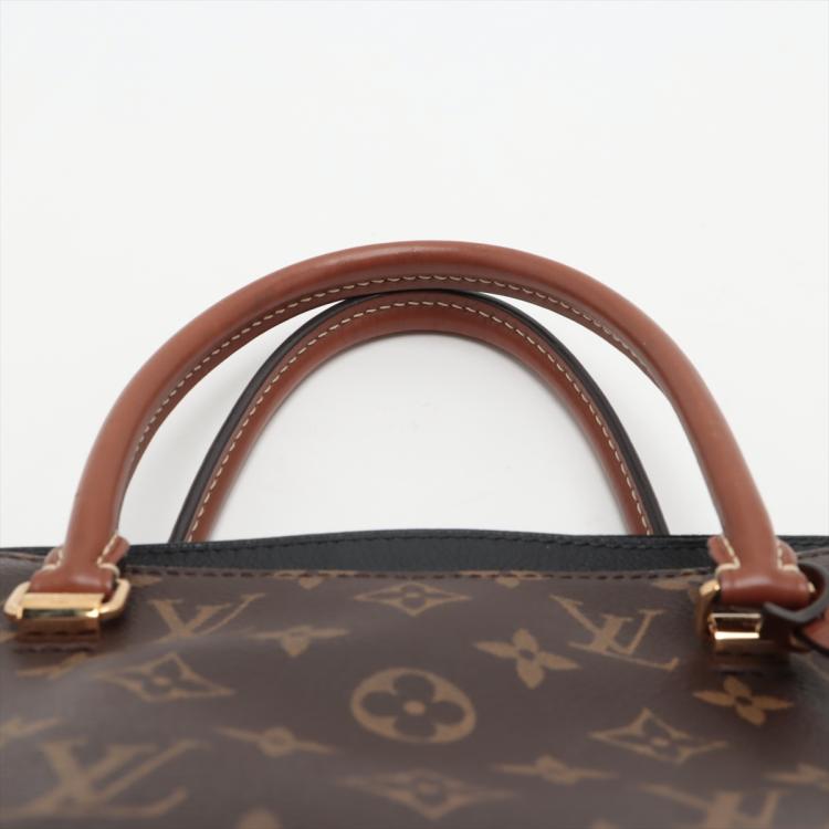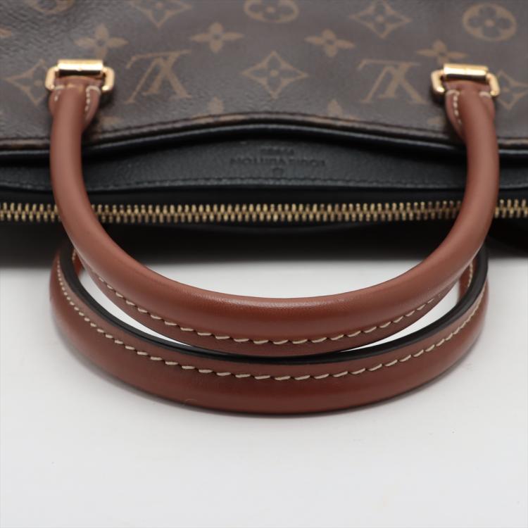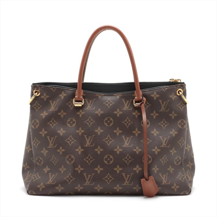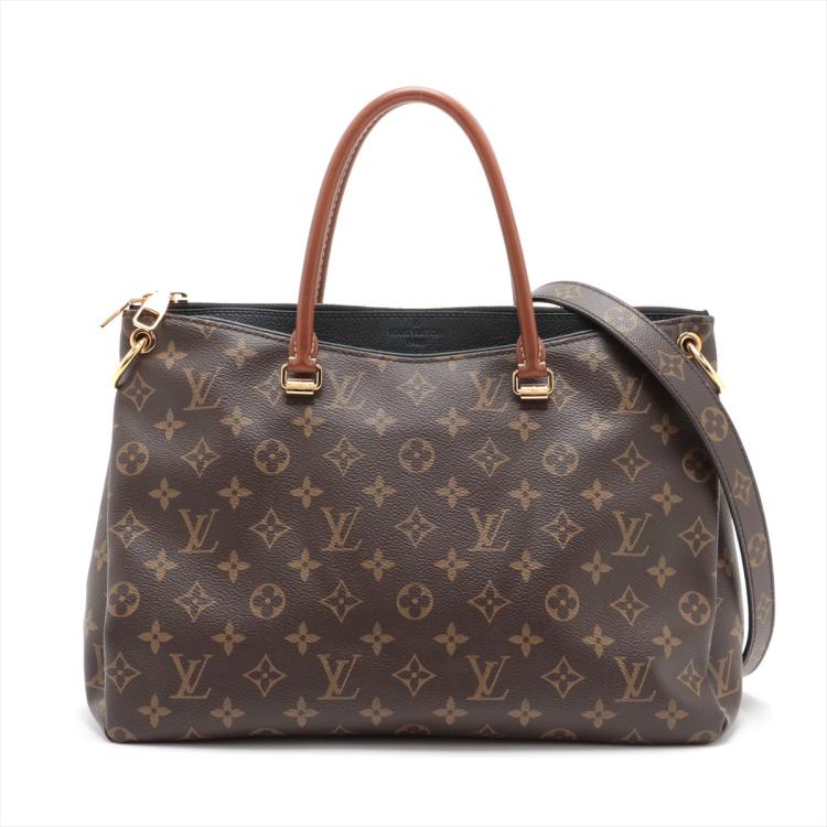 Louis Vuitton Pallas MM bag in Monogram canvas and black leather. Featuring exterior pockets at front and rear, gold-toned hardware, rolled brown leather handles. The top zip closure opens to black microfiber lining interior with patch pocket. Approximate dimensions: 34cm(L) x 26cm(H) x 12.5cm(D), 11cm handle drop, 30cm detachable strap drop. Accompanied by a padlock, leather crochet and keys. With Entrupy Certificate of Authenticity. (Pre-owned)