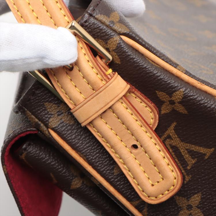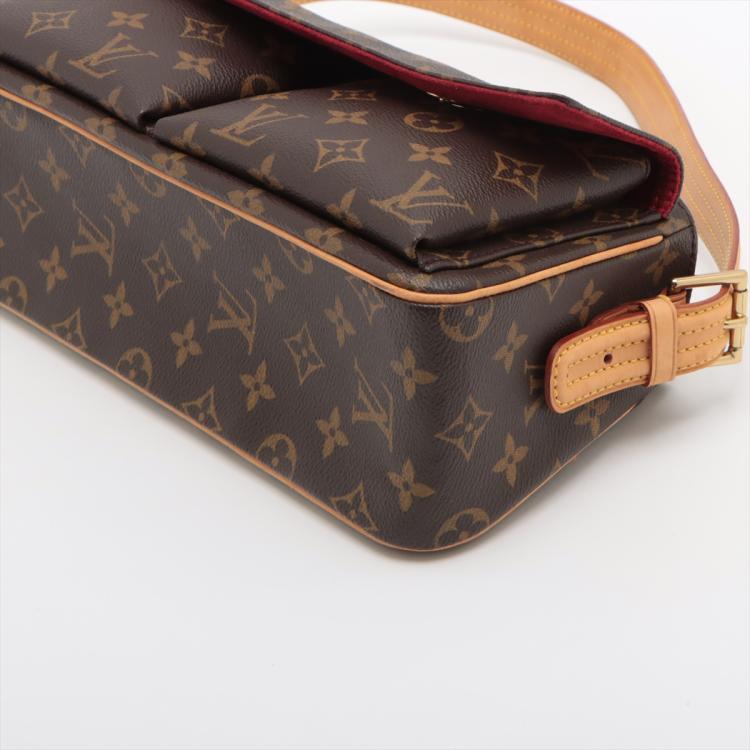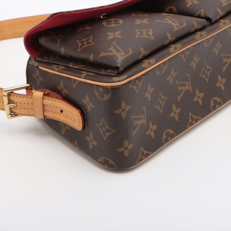 Louis Vuitton Viva Cite MM in Monogram canvas. Featuring leather trims, gold-toned hardware, two exterior pockets with a front flap with 2 magnetic button closure, and an adjustable and detachable strap. The top zipper opens to a red microfibre interior with two patch pockets. Approximate dimensions: 30cm(L) x 13.5cm(H) x 9cm(D), shoulder strap height 27.5cm. Accompanied by a LV dustbag. With Entrupy Certificate of Authenticity. (Pre-owned)